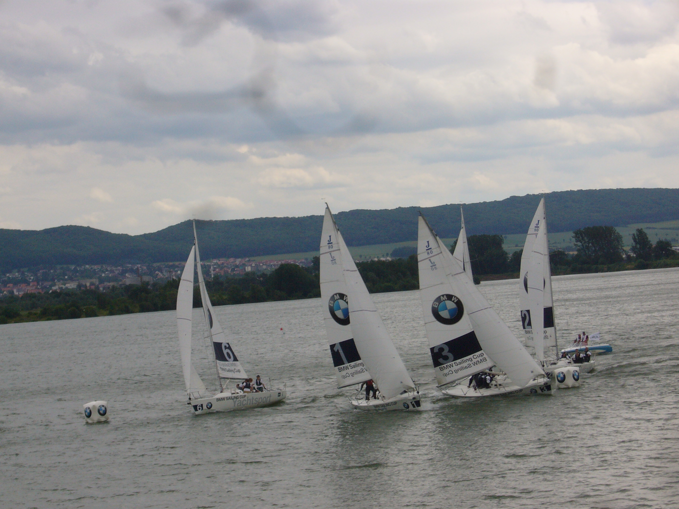 „Raum!“ – „Raum!!!“ – „Raum!“ – „Weg da!“ – „Protest!“ – „Ihr müsst abfallen!“ – „Vorsicht, Baum von hinten!“ Fünfzehnfaches Geschrei von drei Booten, die sich bei Start direkt neben dem Prahm inander verhakt haben. Des dicken Schiedsrichters Arm wies auf alle drei: „Penalty! Penalty! Penalty!“ Wir in der Mitte , natürlich völlig unschuldig an der Misere, versuchten uns freizufahren, bevor wir unsreren Strafkringel drehen. Da rammte uns schon wieder einer, der gerade seinen Kringel fuhr, voll rein. Dessen Skipper sah uns wohl nicht und achtete auch nicht auf das Warngeschrei seiner und unserer Crew. Wir mussten uns nochmal freifahren, kringeln und dann konnten wir endlich zur Luvtonne und um sie herum. Den anderen hinterherfahren. Wir konnten im Laufe der abzufahrenden Bahn gut aufholen, doch Vierter bedeutet im „Hoffnungslauf“: draußen. Long faces on bord. In der Wechselzone ging es hoch her, wir mussten warten, bis wir rangerufen werden, deshalb fuhren wir in der Nähe rum. Die Fock konnten wir nicht mehr einrollen, da die Rolleinrichtung lädiert war. Ein kleines Motorboot mit Jugendlichen enterte uns, wir versuchten ihnen klarzumachen, dass erst der Schaden behoben werden muss, doch sie wollten das Schiff jetzt unbedingt übernehmen. Der Skipper ging als erstes von Bord, also mussten wir hinterher, doch das war gar nicht so einfach, Wind, Wellen, Schaukelei, drohender Landfall, Geschrei, steuerloses Boot, gleichzeitiges Ein-und Aussteigen von 10 Leuten – nichts wie runter jetzt in das kleine Motorboot! Wir mussten nochmal anfahren, um die beiden, die das Umsteigen nicht geschafft haben, zu holen. Wasser von unten, nasse Füße, nasser Hintern, Wasser von vorne, nasser Oberkörper, zum Steg war es zum Glück nicht weit. Aufgeregte Diskussionen mit dem Schiedsrichter, der natürlich nicht gesehen hat, das der Baum des luvwärtigen Boote uns aufgespießt und ausgebremst hat und wir somit keinerlei Möglichkeit hatten, dem leeseitigen Boot auszuweichen. Obwohl das ganze Chaos sich drei Meter neben dem Startschiff abspielte, konnte im Nachhinein keiner das „innere“ Boot für die Schadensmeldung identifizieren. Ebenso interessant: Natürlich diskutierten und kommentierten wir diese unsere letzte Wettfahrt den ganzen Nachmittag lang, auch mit der „Rammcrew“. Doch schon eine Stunde danach hatten wir alle unterschiedliche Erinnerungen, nach dem Bier, als der Adrenalinspiegel sich wieder einpegelte.