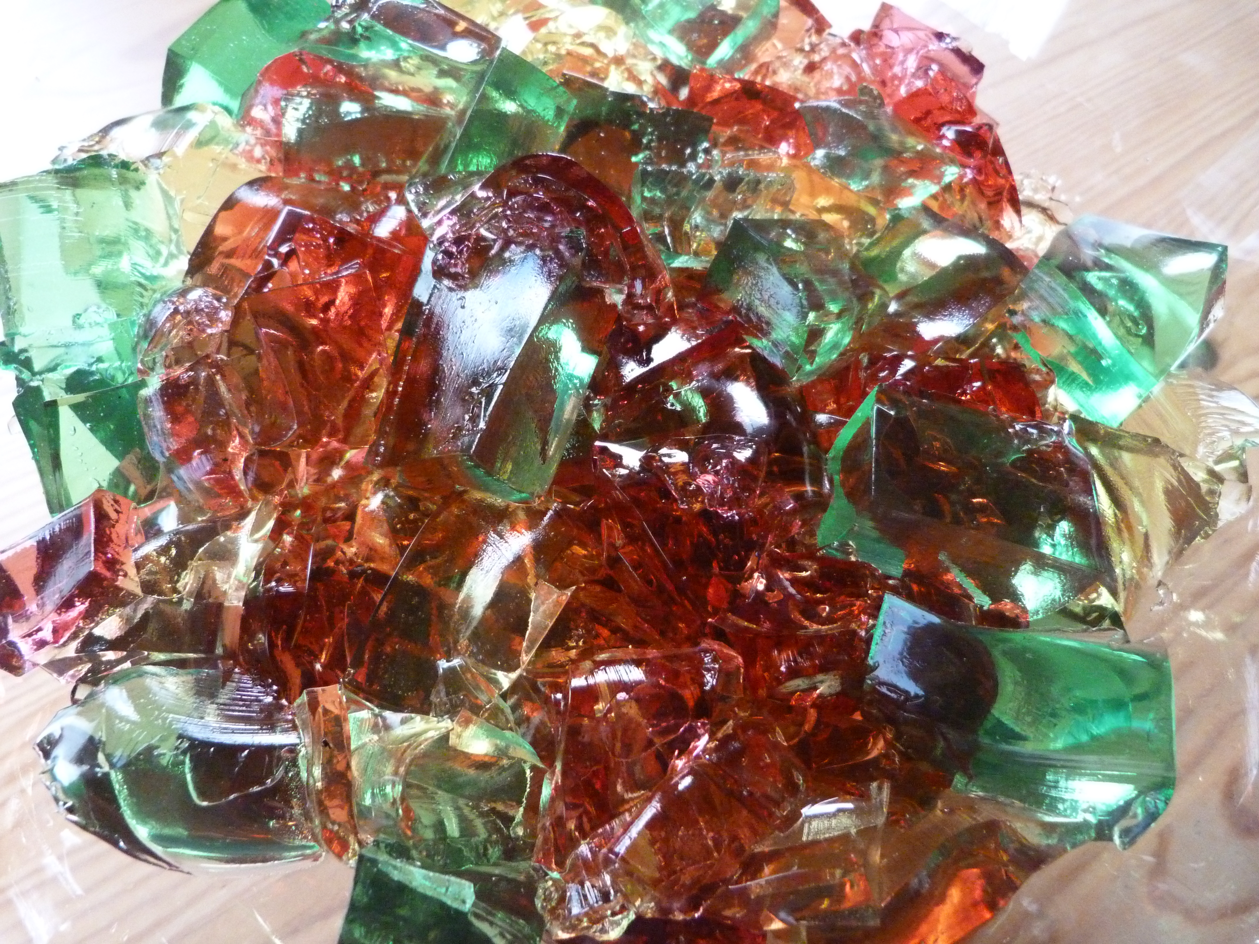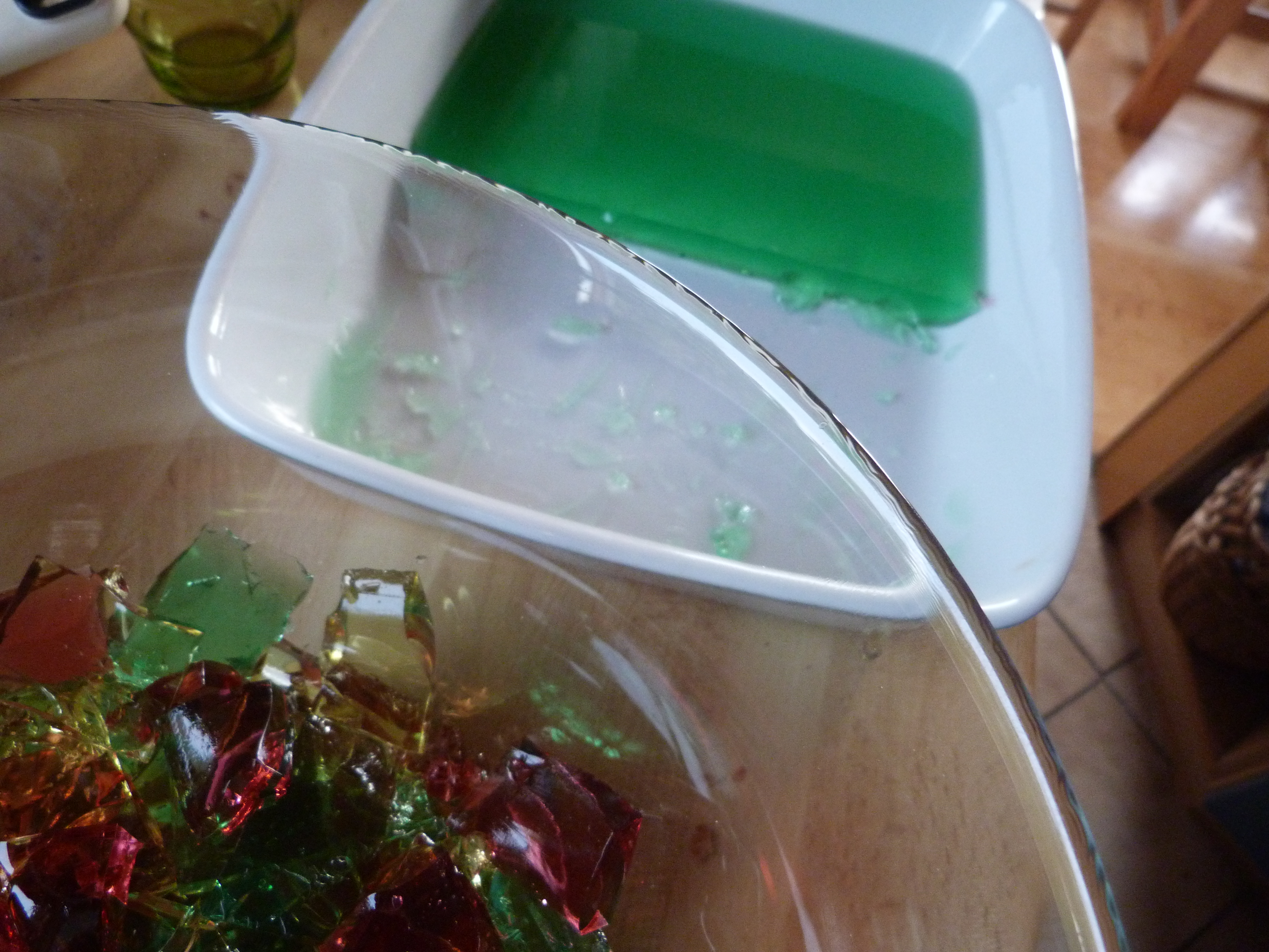 Probieren wollte ich das schon lange mal ob ich das hinkriege. Rotes, gelbes und grünes Pulver mit heißem Wasser übergießen, ab aufs Blech und jetzt ins Kalte!