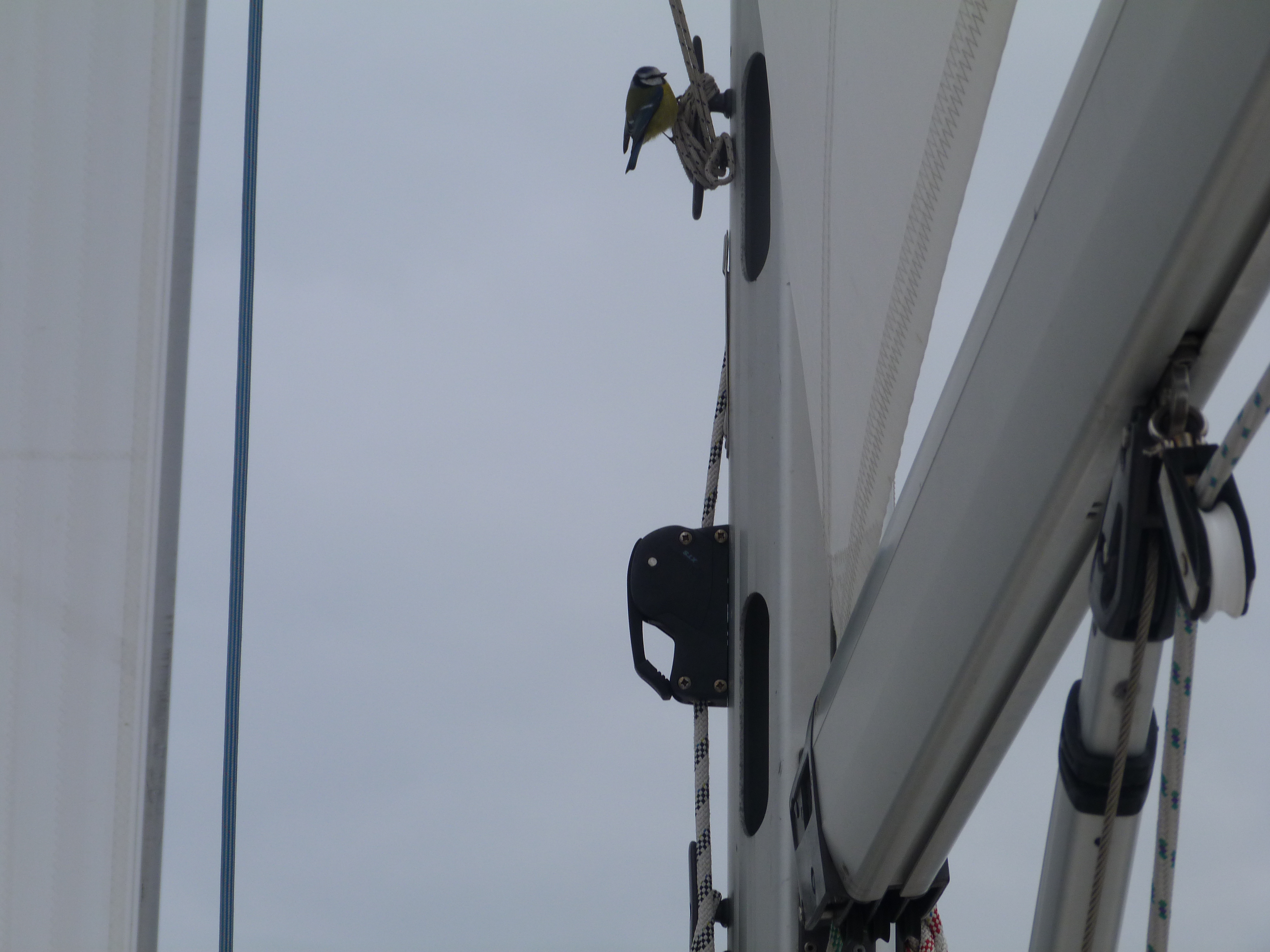 Bei einer soliden 5 (Windstärke), sehr böig und von Nordwest, ruhte sich eine Meise auf der Amara aus. Sie pickte an den Schoten herum und untersuchte alles ganz genau. Nach etwa 10 Minuten und einer Seemeile flatterte sie wieder davon, genug Kraft getankt für den Weiterflug. Am Abend vorher hatten wir auch schon Besuch, von zwei bettelnden Schwänen. Die mussten aber draußen bleiben.