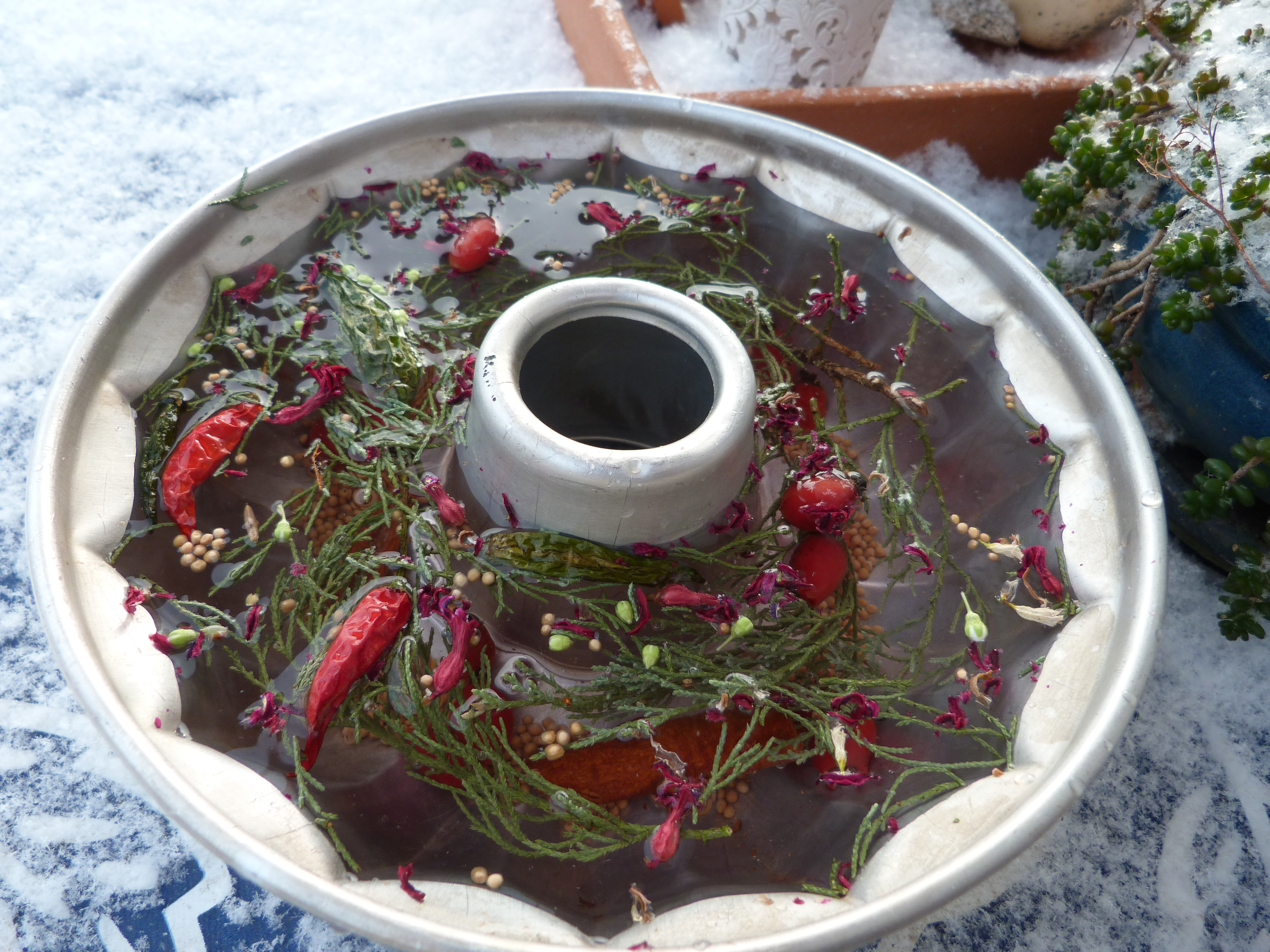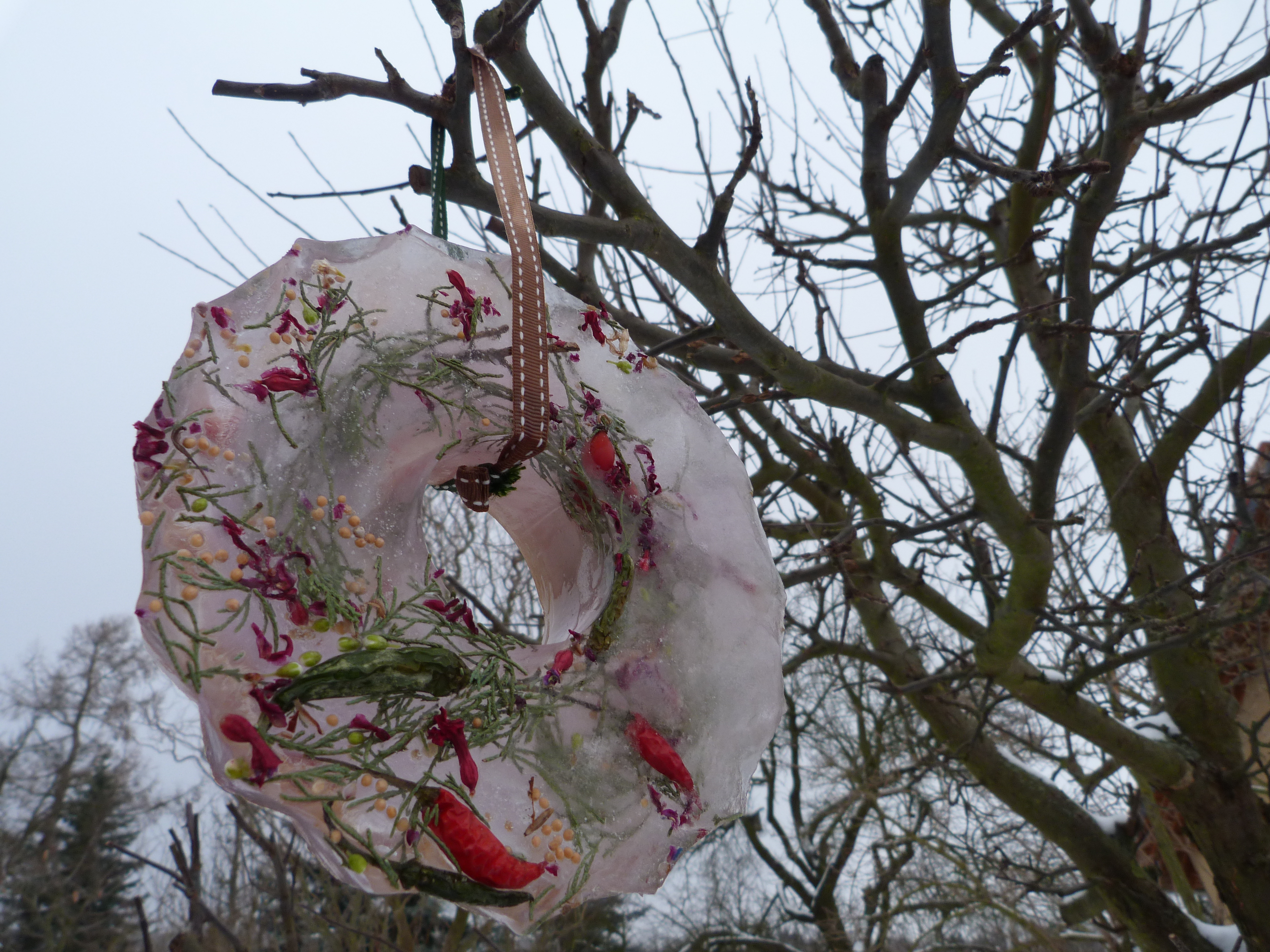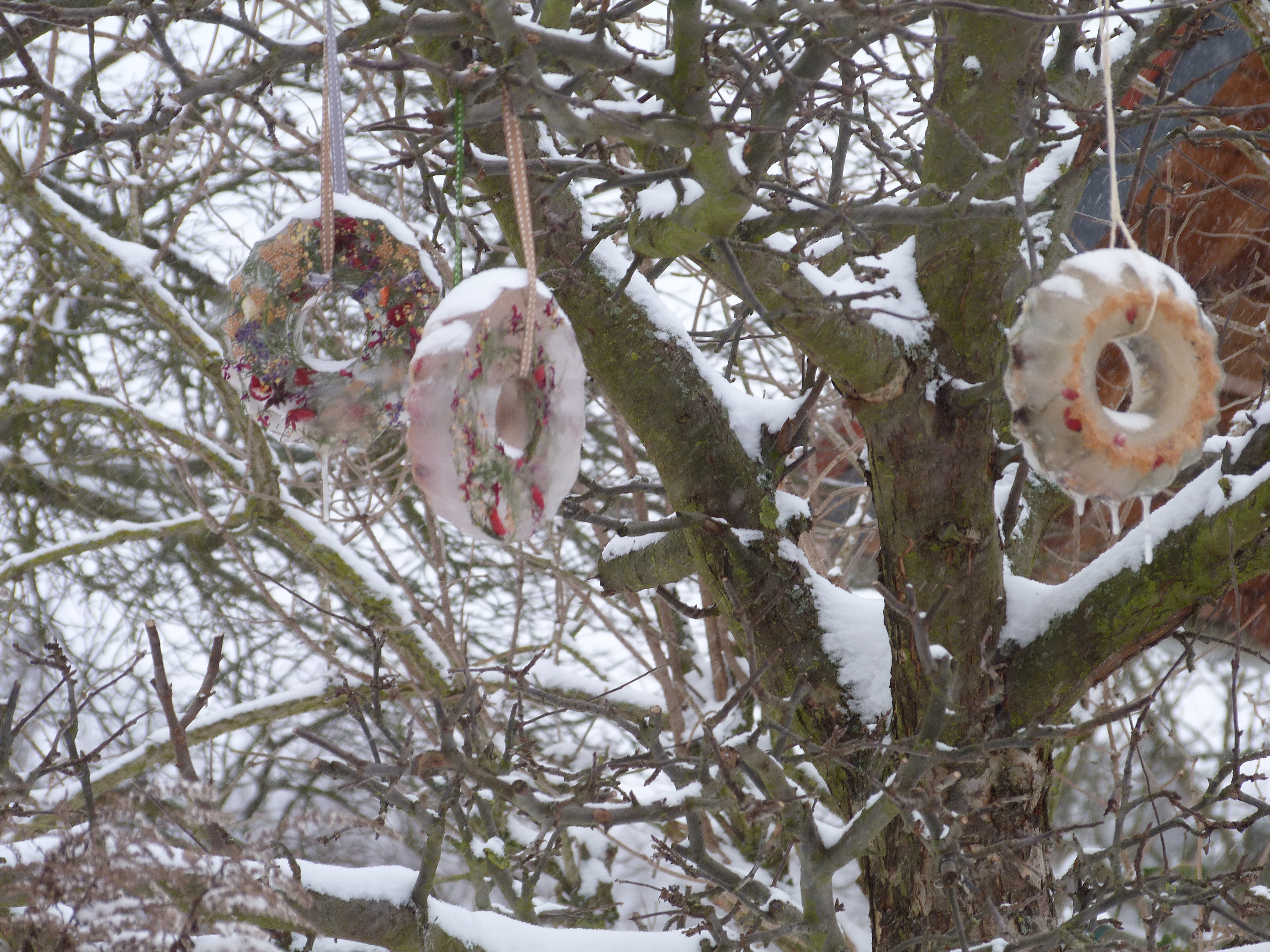 Jetzt hängen im Apfelbaum einige eiskalte Kuchen, zumindest ein Weilchen, bis es wieder wärmer wird. Bei C. habe ich es gesehen, sie hat eiskalte Kerzen“gläser“ auf dem Gartentisch. Es ist so einfach: Kuchenform, Plastikdose oder Eisbehälter mit kaltem Wasser füllen und Sachen reinschmeißen: Senfkörner, Blütenblätter (von verblühhten Hyazinthen), Tannengrünchen, Chili, altes Müsli, Hagebutten, Muscheln, Zimtstangen, Perlen, Figürchen, Pfefferkörner, Vogelfutter…. Nach draußen stellen. Nach ein paar Stunden ist es durchgefroren, kurz von der Behälterseite kaltes Wasser darüber laufen lassen, auslösen, Band oder Strick drum, aufhängen, fertig. Wenn es taut, fällt natürlich alles runter, dann freuen sich die Vögel. Sieht lustig aus. Eiskalt.