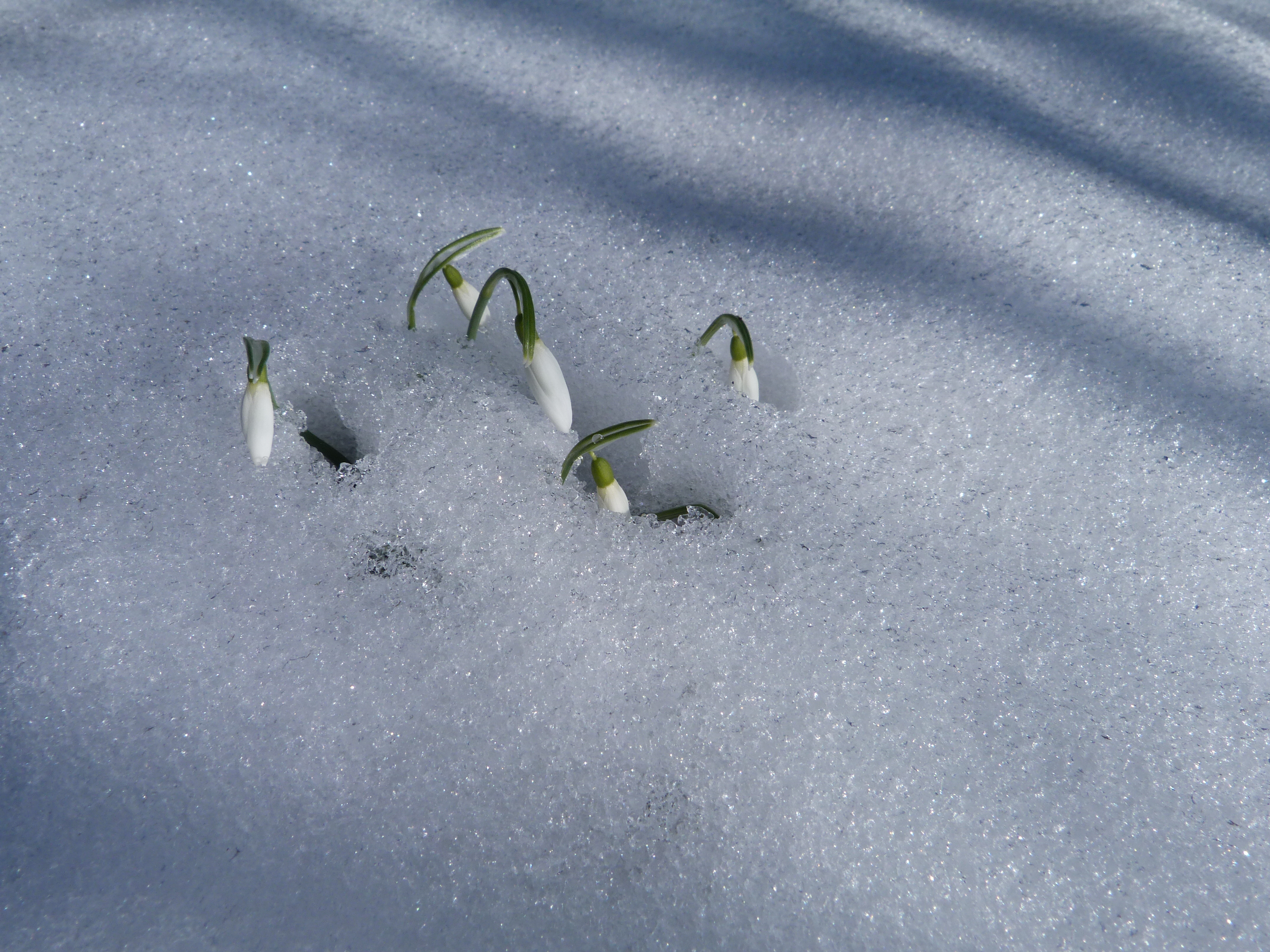 Unglaublich! Die Sonne scheint! Ich nehme an, das Ding am Himmel ist die Sonne, sie hat sich ja so lange nicht blicken lassen. Und jetzt geht es den Schneemassen an den Kragen! Die Katzenspuren quer über das Grundstück sind schon weggetaut und vom Dach stürzen Lawinen. Das veranlasste das große Kind beim Mittagessen zu bemerken, das alles das Dach runtergehe. Und endlich, endlich, sind wir mal wieder gelaufen. So schnell, so. Oder fast schnell. Galgenweg, durchs Städtchen, Kirschweg und durchs Dorf wieder hoch. So schön im Sonnenschein! Auf der Wiese neben dem Haus guckten heute Morgen an einigen Stellen grüne Spitzen aus dem Schnee. Schneeglöckchen! Hurra!