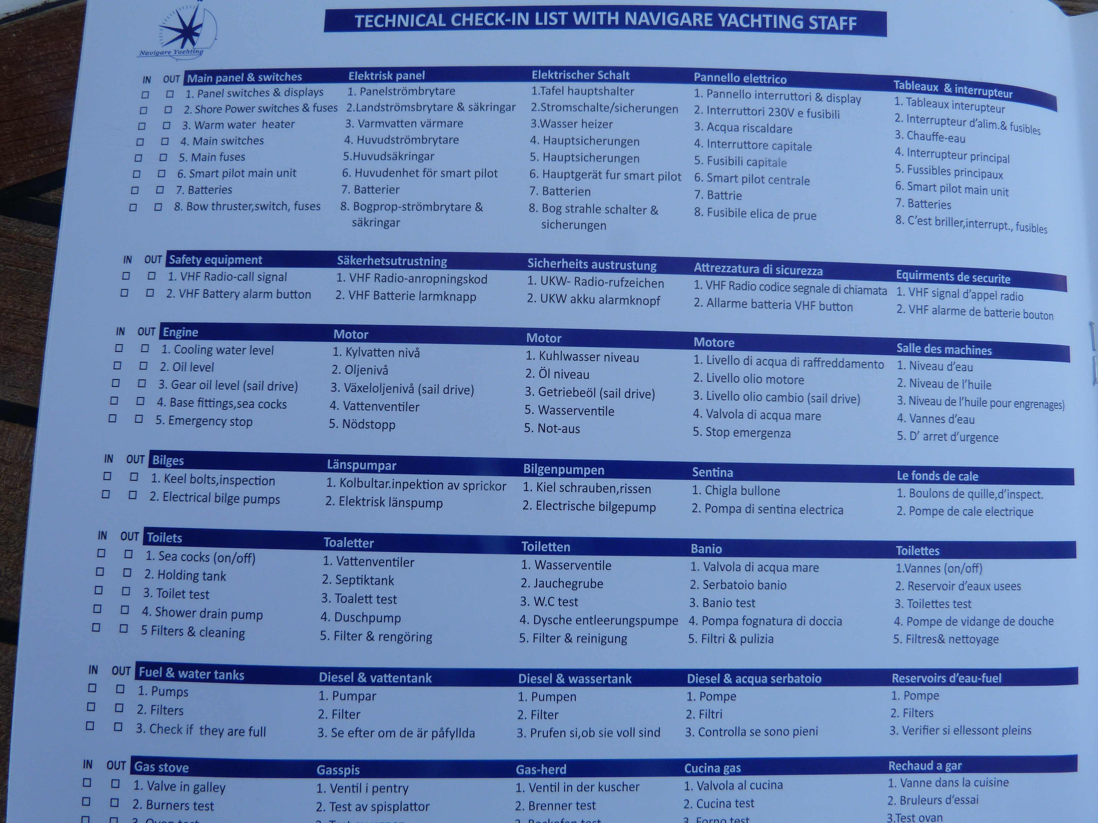 Die Übergabe dauerte sehr lange und war sehr gründlich, denn einmal war eine 6-seitige mehrsprachige Checkliste (mit Preisen bei Verlust) abzuarbeiten und alles zu finden und dann kamen zwei Navigare – Mitarbeiter an Bord und gingen mit dem Skipper nochmal alles durch. Sie haben sofort geholt, was noch fehlte( Nebelhorn, Scheinwerfer…) und einiges noch repariert (Kühlwasserpumpe, Autopilot)