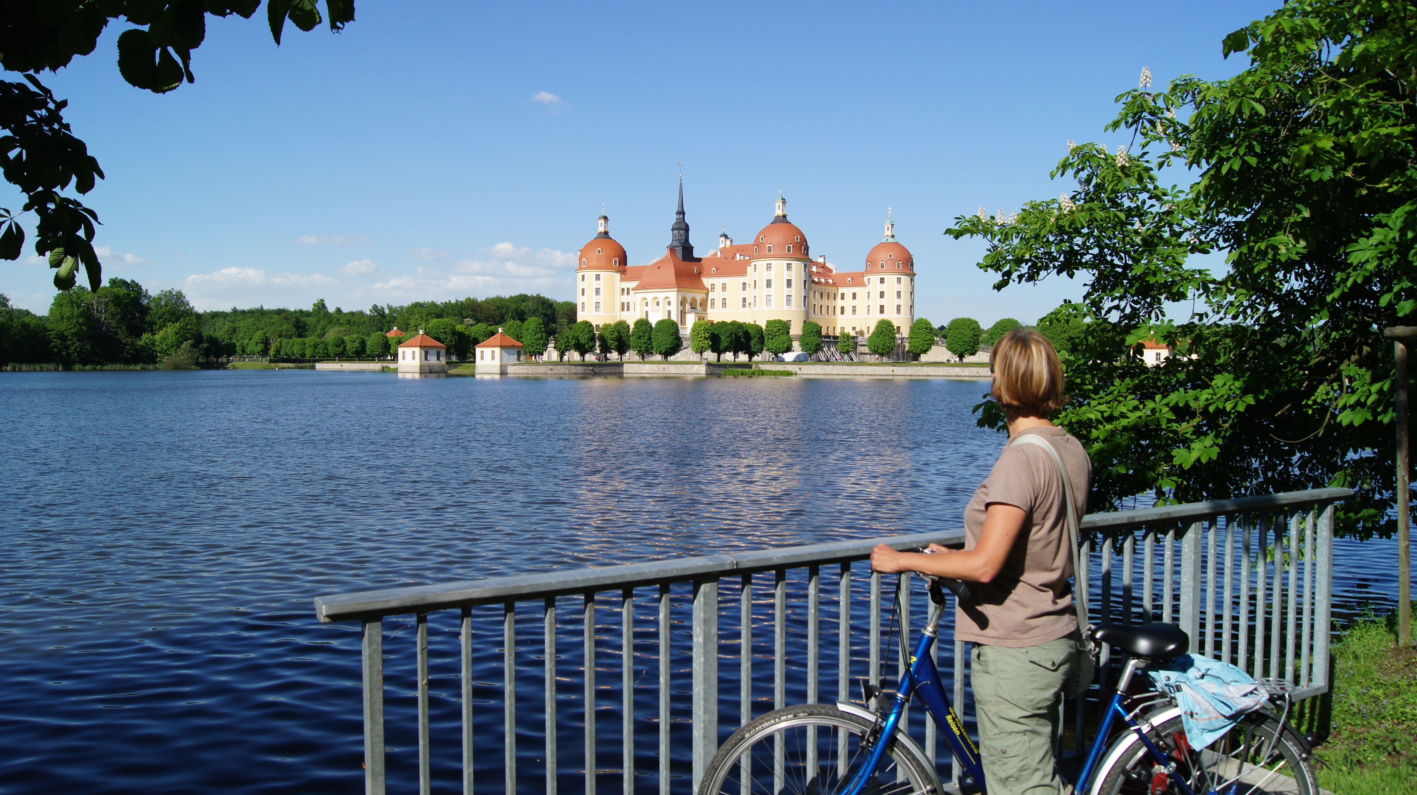 Sonntag: Tour mit Fahrrädern, 58 km: Nassau – Bosel-Garten /zu Fuß) – Elbe-Radweg- Radebeul, Villa Shatterhand (Karl-May-Museum), Essen – Lößnitztal (und berghoch!) – Moritzburg – Niederau (durch den Wald), Essen im Hotel; Wetter: schönster Sonnenschein und sehr warm, nachts wohl Gewitter