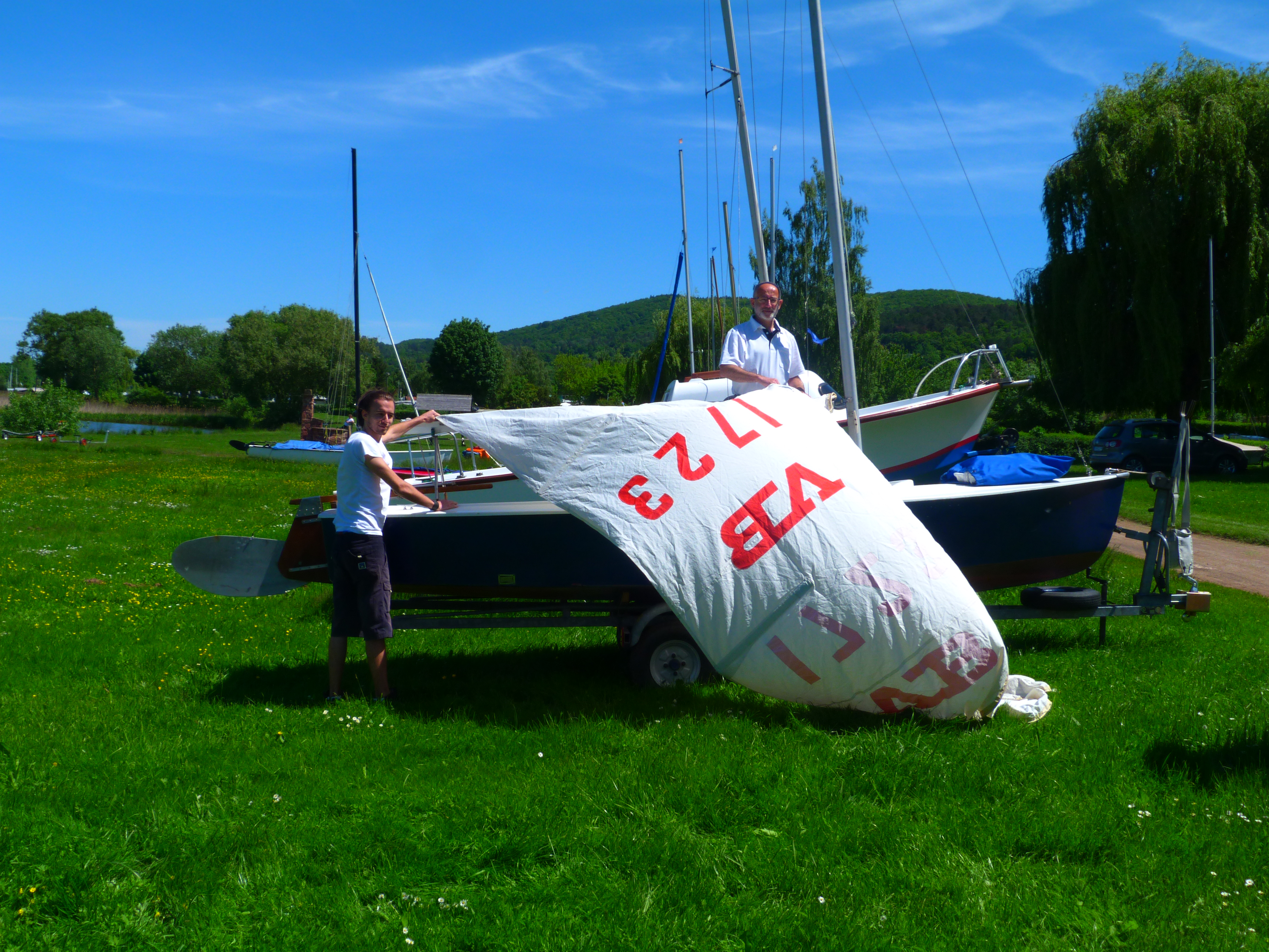 Das erste Mal segeln wir bei besten Bedingungen auf dem Stausee, zu dritt. Schnell ist auf- und auch wieder abgebaut, denn Klein-F. ist mit dabei. Wir genießen drei Runden schönes Segeln!