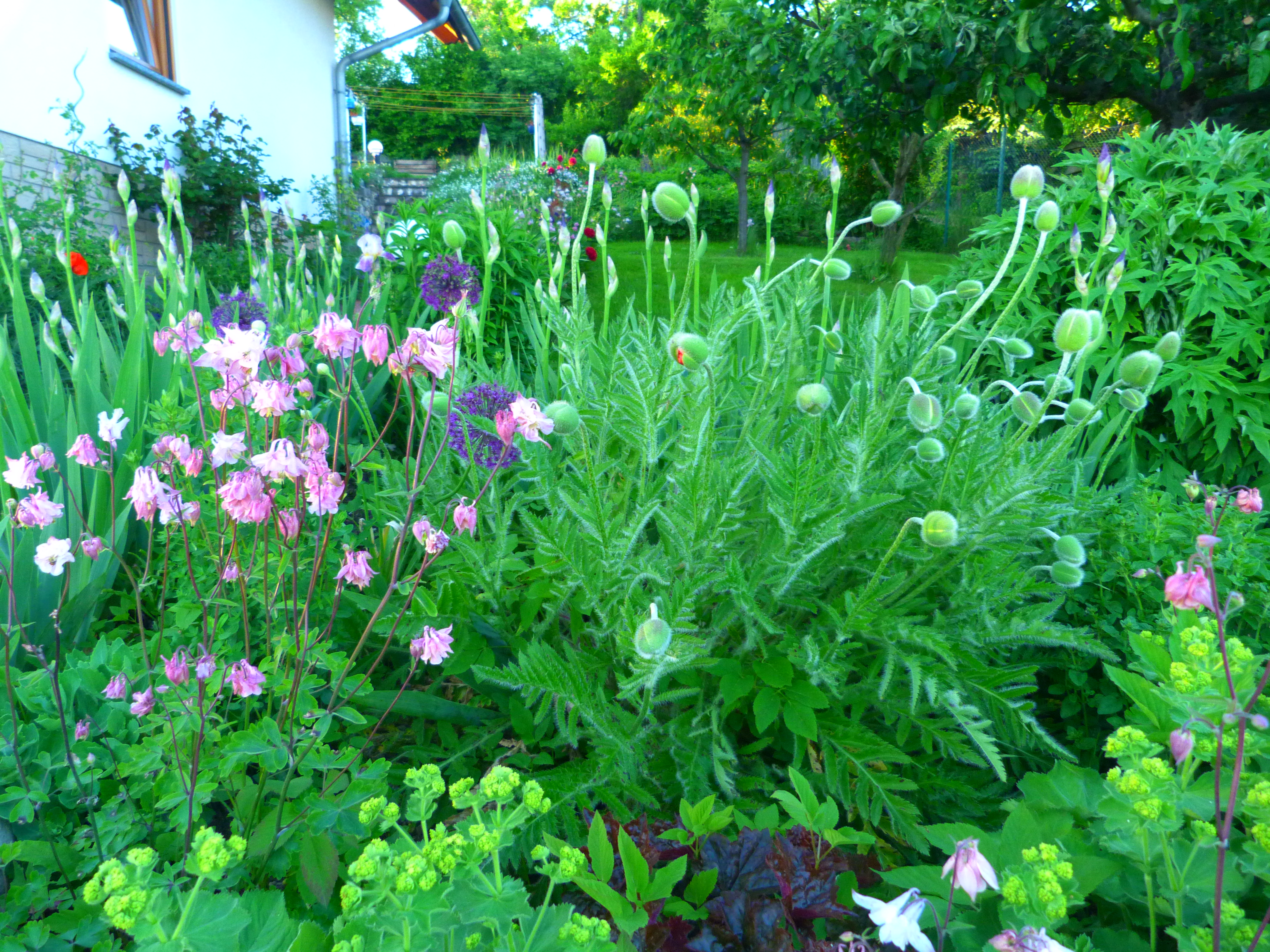 Endlich blühen die Pfingstrosen, die Akelei in allen Farben,der Mohn und die Schwertlilien öffnen ihre Blüten. Wir genießen den Garten am Haus: