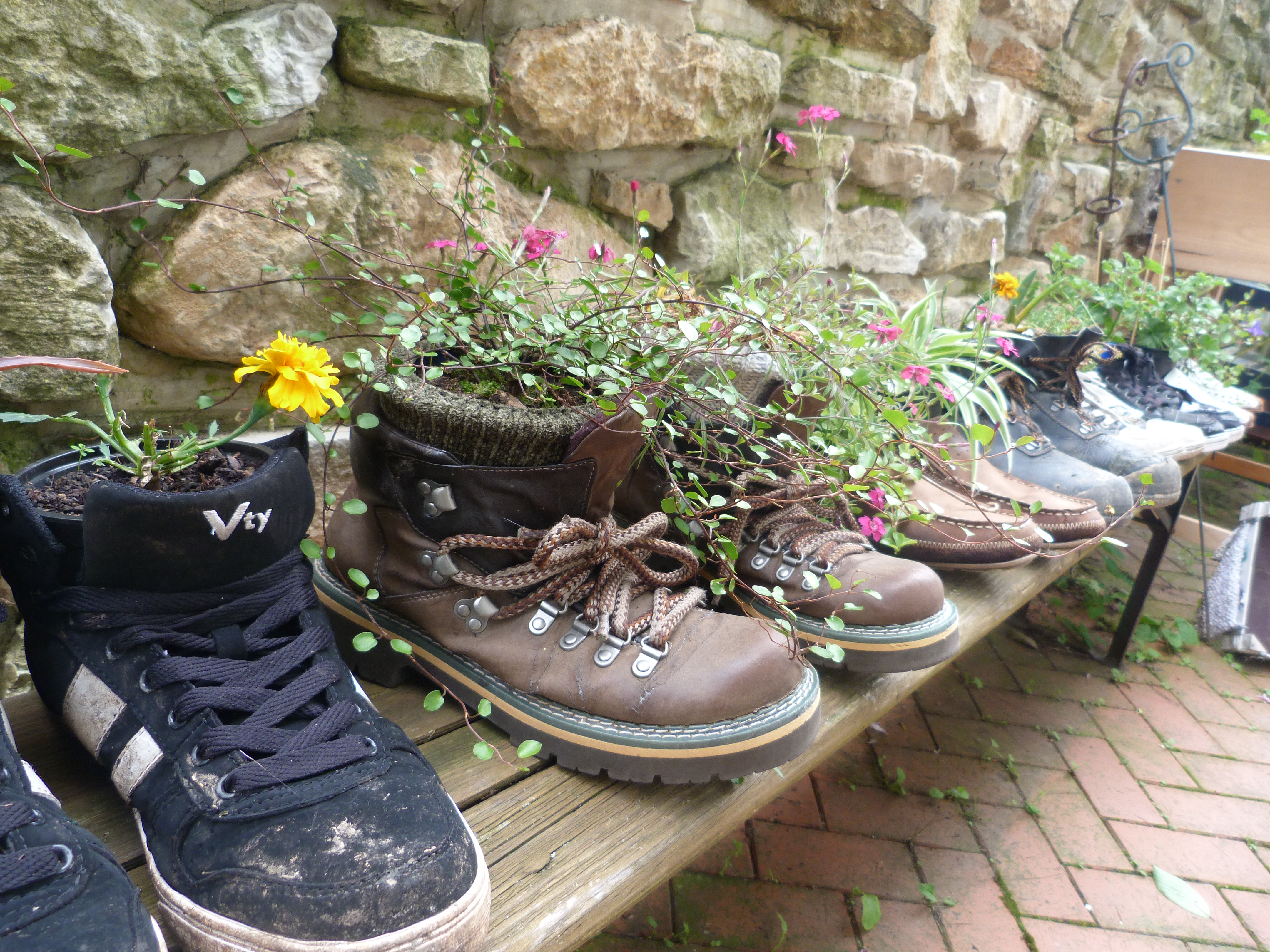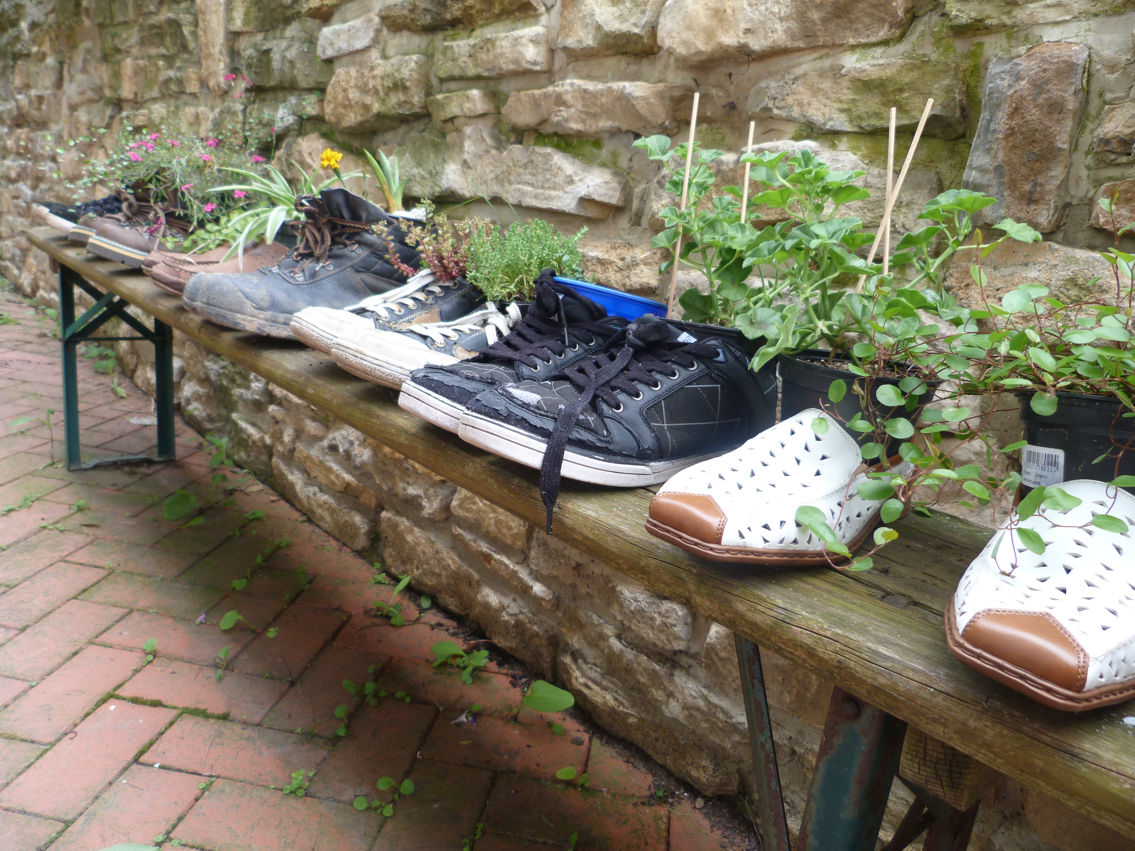 In den offenen Gärten habe ich viele neue Ideen bekommen, aber bepflanzte Schuhe waren nicht dabei. Diese Inspiration kam aus einem Café, beziehungsweise dem Besuch in diesem. Alte Schuhe verstopfen unsere Schuhkommoden, aber dürfen seit geraumer Zeit nicht mehr weggeworfen werde. Jetzt stehen sie (noch) in Reih und Glied auf einer Holzbank vor der Mauer hinter dem Haus. Kann gut sein, dass sie bald woandershin wandern. Die nächste Idee, die ich verwirklichen möchte, benötigt alte Gugelhupf-Formen. Die Nachbarschaft habe ich gleich gefragt, alle haben sie gerade oder vor kurzem weggeworfen! Da bleibt wohl nur noch der Flohmarkt.