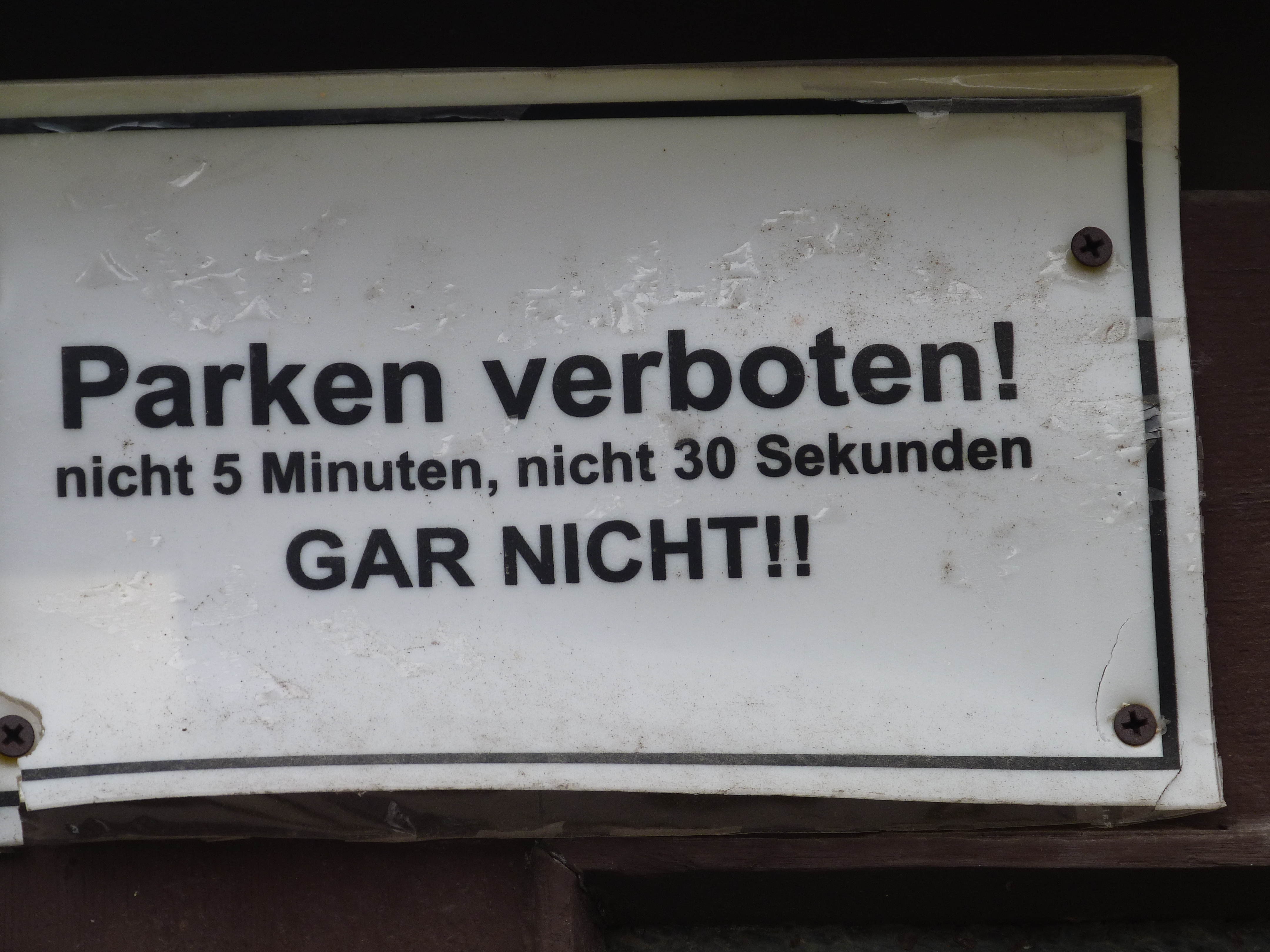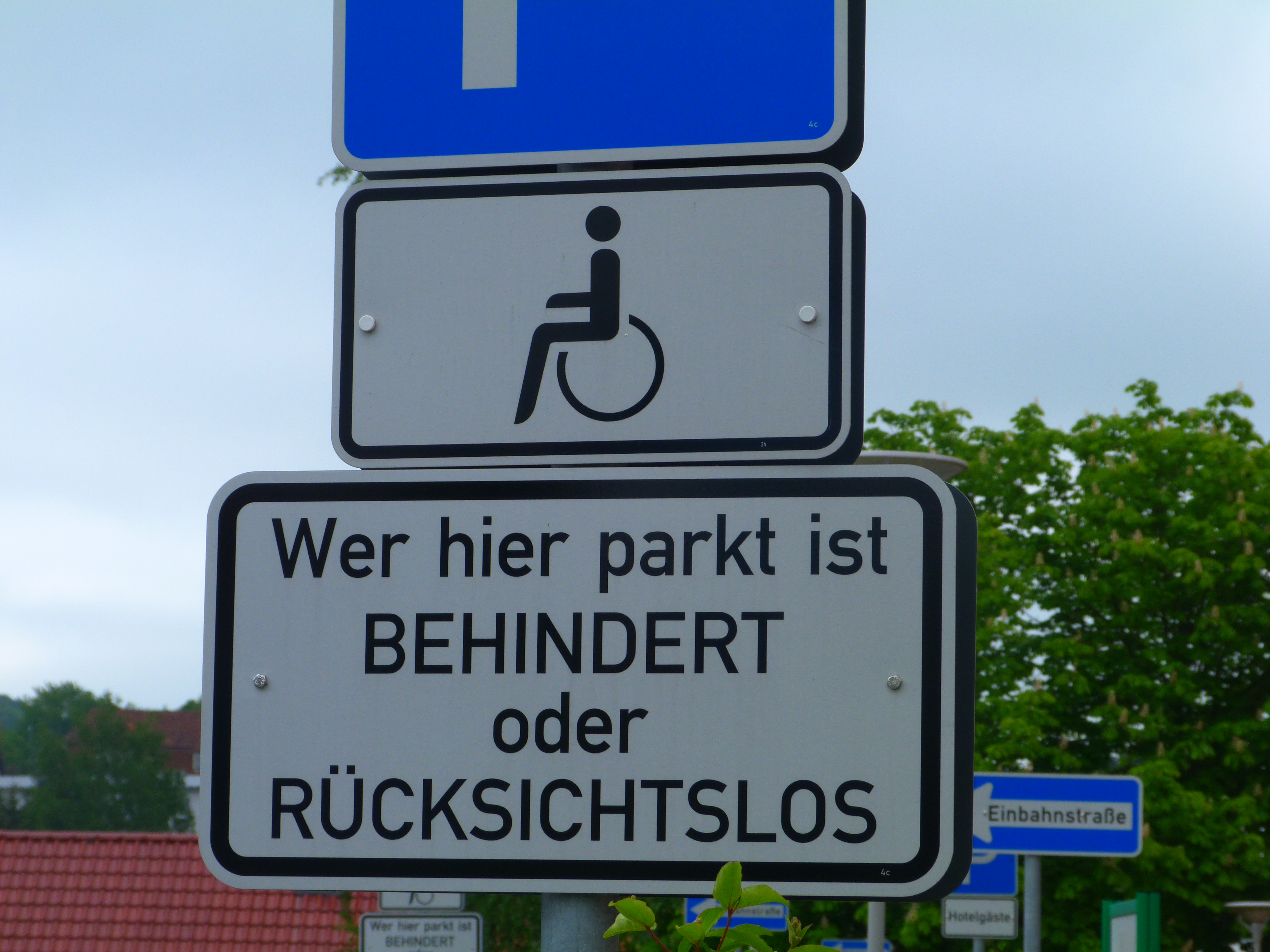 Soll wohl lustig sein, dieses Schild. Für wen wohl? Bin ich „behindert“, ärgere ich mich über die politische Inkorrektheit, bin ich rücksichtslos, stört mich das Schild überhaupt nicht. Ein „und“ ist ausgeschlossen. Bin ich dumm, brauche ich diesen Hinweis: