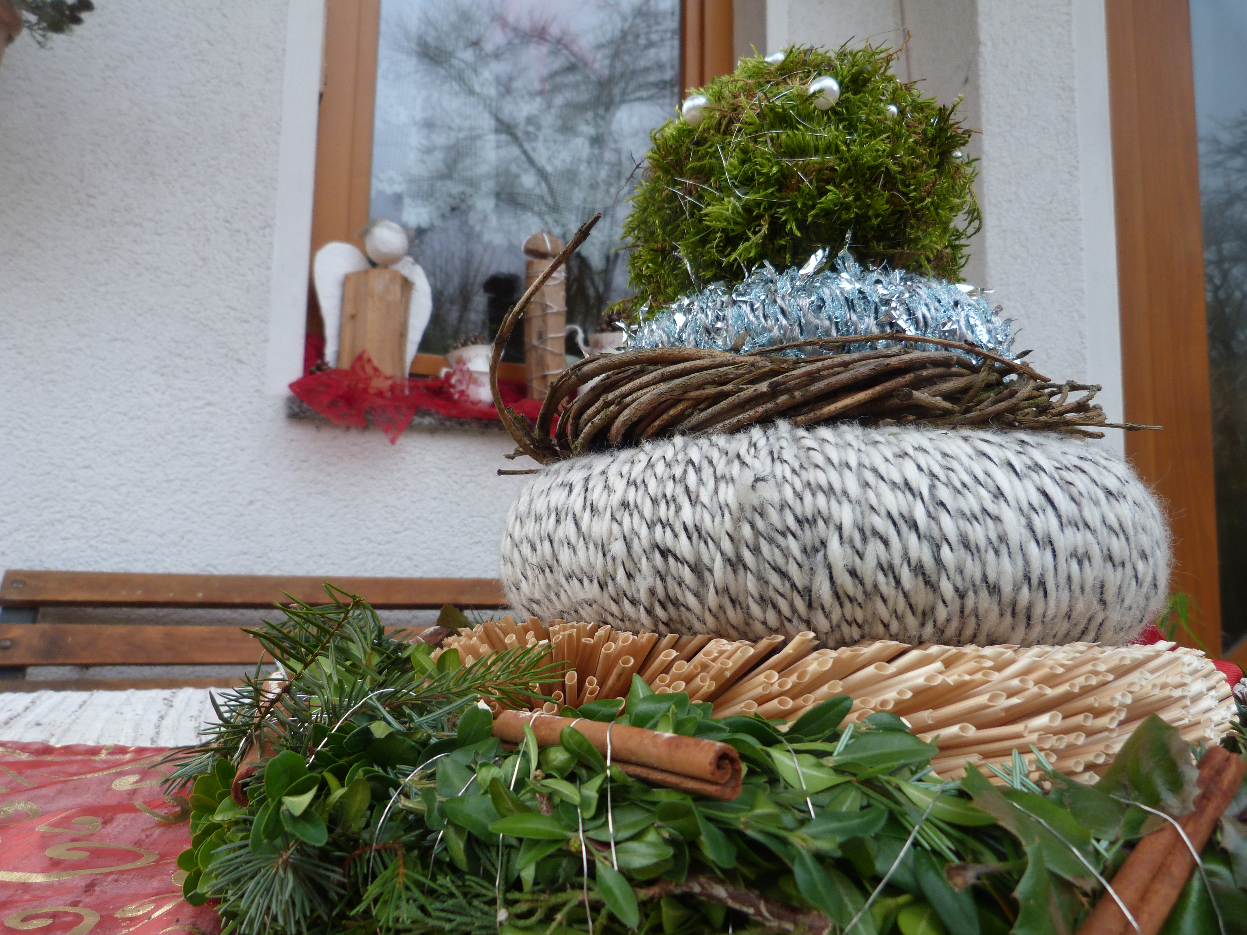 Lichterketten, die im Wind zappeln, rechts und links an den Dachrinnen; Lichterketten, Dekokugeln und Tannenzapfen im Flieder neben dem Haus; Kerzen, Zapfen und Sedum in Tontöpfen auf den Mäuerchen vor dem Haus; Tannengestecke neben der vorderen Tür, Kleiderbügel an der Hausnummer; Holzengel und Kaffetassenmit Zapfen auf rotem Samt im Fensterbrett, davor auf dem Tisch eine Pyramide aus Kränzen, mit einer Mooskugel obendrauf; eine hängende Zapfen/Dekogirlande am Blumentopf; Palette mit diversen Basteleien, Ästen und Kerzen an der Mauer; Weinballon mit Kerze daneben. Natürlich überall Tannengrün. Jetzt fehlt nur noch der Schnee, dann machen wir Feuerchen, trinken Glühwein und grillen! So. Jetzt Weihnachten!