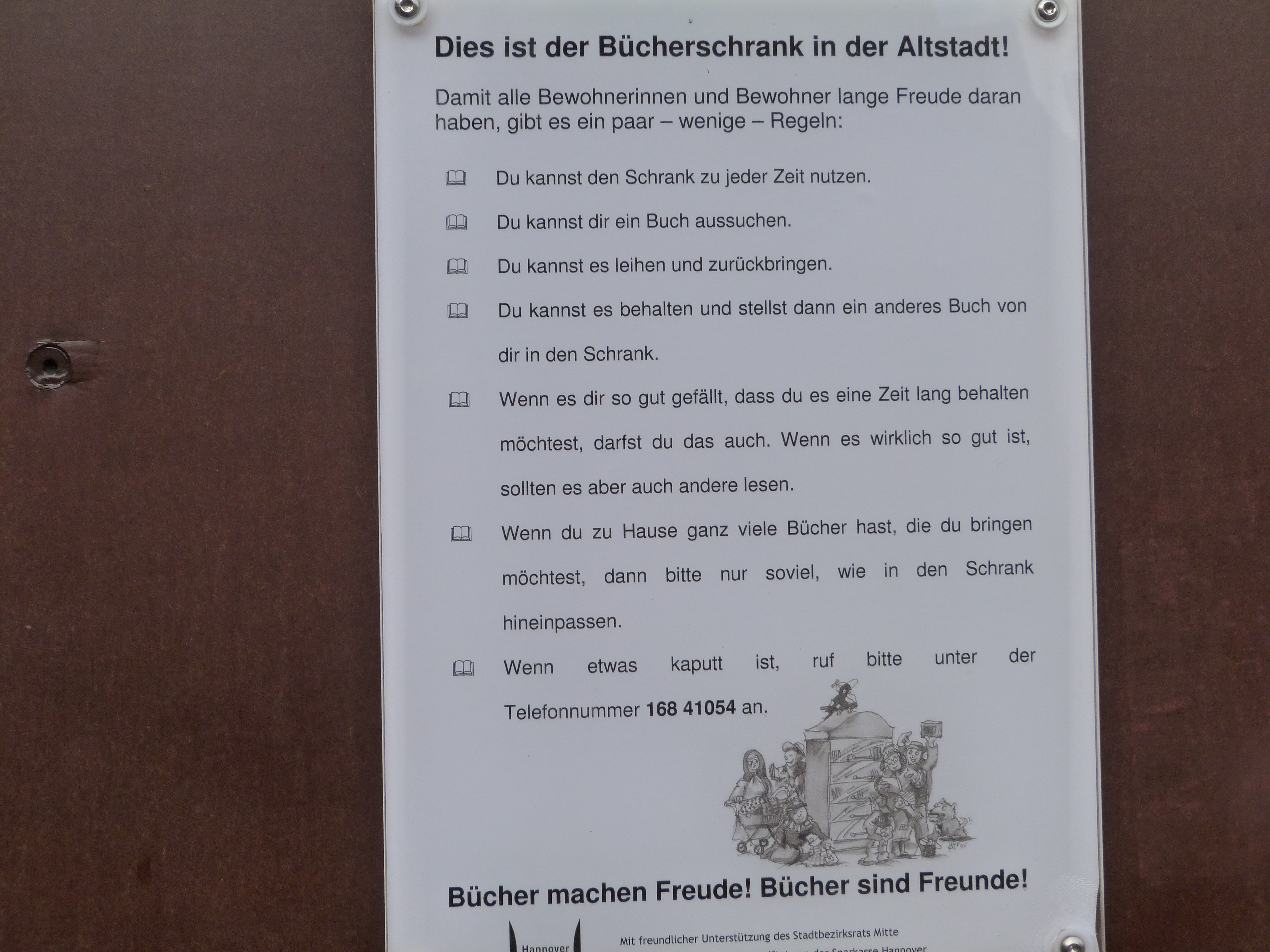 In vier Wochen beim Ostsee – Ansegeln muss ich bestimmt mal aufs Klo, beim kurzen Landgang. Die Bücher, die ich in die Kiste legen werde, habe ich mir schon vorgemerkt. Freut sich jemand drüber, denke ich. Dort gibt es lediglich den Hinweis: „Gib eins, nimm eins!“. Am Bücherschrank in Hannover sind die Regeln etwas ausführlicher, aber durchaus nett und nachvollziehbar.