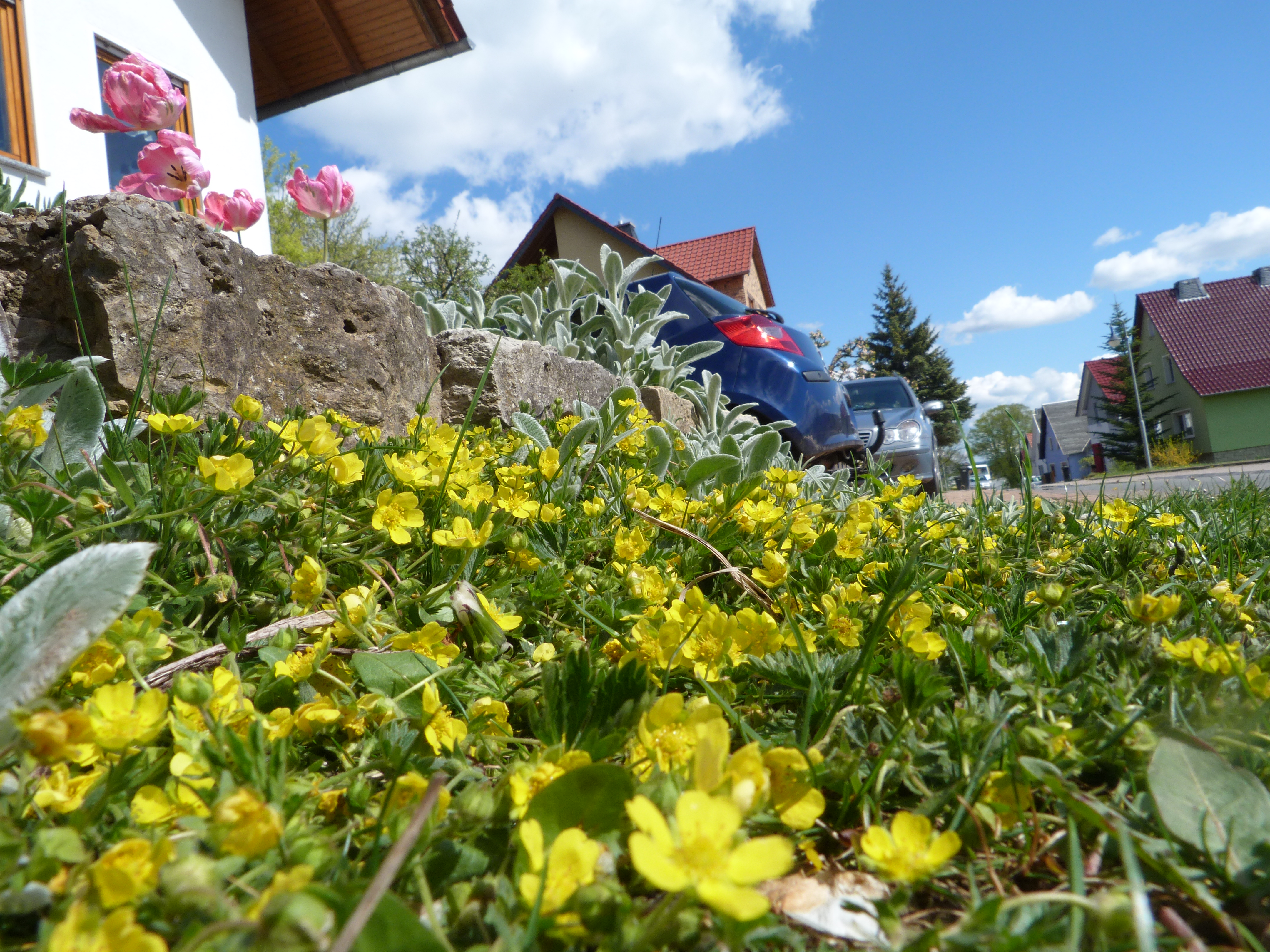 Wunderschöne Ansichten und Aussichten, wenn man übers Land fährt. Weiße Wolken, blauer Himmel, gelber Raps und andersgelber Löwenzahn, frisches Grün und eine Blütenpracht, wohin man schaut. Jedes Jahr aufs Neue das große Erstaunen, was die Natur in ein paar Tagen hervorbringt. In diesem Frühjahr eben schon Mitte April: Spargel, Rhabarber, Flieder und die Kastanien haben auch schon dicke Blütenansätze. Die Ostereier am Fliederbaum muss ich wohl abschneiden. Die Rasenmäher in der Nachbarschaft brummen den ganzen Tag. Dabei sehen die Gänseblümchen so schön aus!