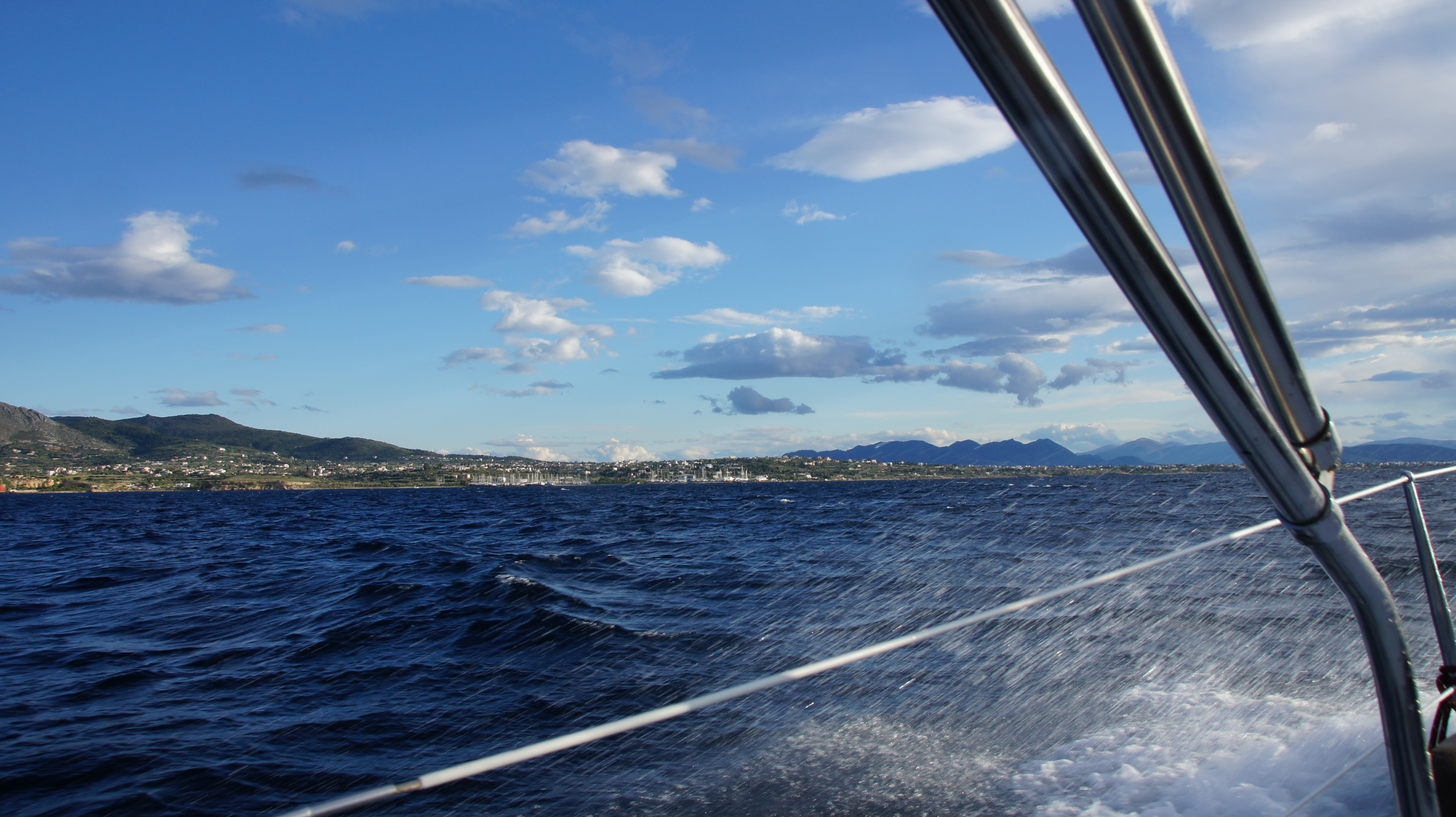 0830 los, 1300 am Eingang zum Kanal von Korinth, Gebühr: 118,87 Euro, halbe Stunde später feine Durchfahrt, dann Groß und Genua, Wind W 2-3, dann 4-5, im Hafen eine einzige Stelle neben einer großen Motoryacht frei, gut eingefädelt, Anker hält nicht, neuer Versuch, Anker hängt in einer Kette quer durch den Hafen, wir sind also endlich fest.