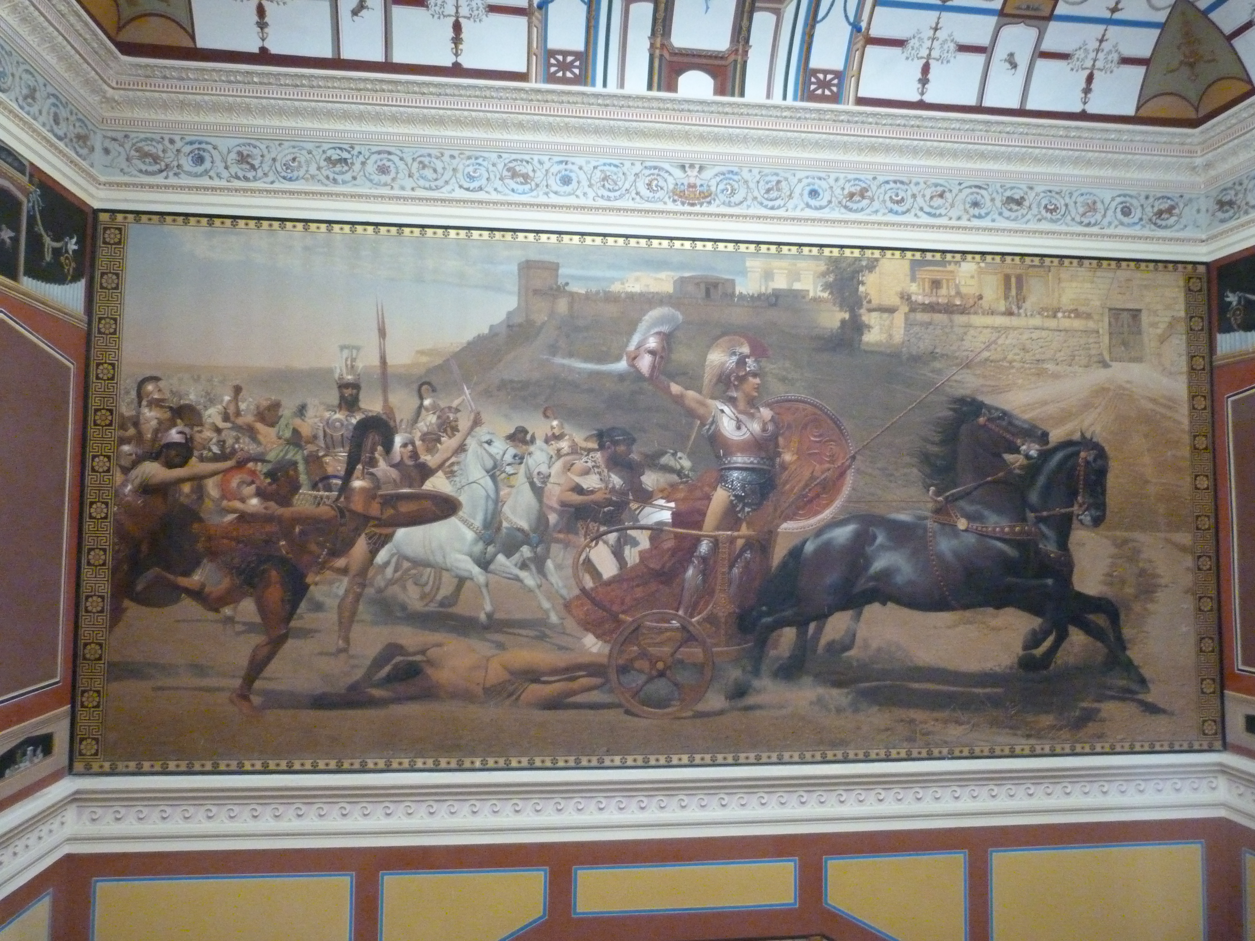 Das Achilleion auf Korfu hat bekanntlich Sissi bauen lassen, denn sie liebte Achilles, las immer wieder Homer. Schliemann buddelte auch gerade Troja aus. Unsere Vorstellungen von Achilles sind durch den Film von Wolfgang Petersen geprägt und natürlich von Brad Pitt: „IST DAS ALLES?“ . Die Filmszene, in der er den besiegten Hektor hinter sich herschleift, wurde genau so als riesiges Wandgemälde vor über hundert Jahren für Sissis Palast gemalt. Sie hat auch eineMamorstatue vom sterbenden Achill in ihrem Park aufstellen lassen. Er ist inzwischen ein bisschen bemost und hat es anscheinend geschaft, den Pfeil abzubrechen.