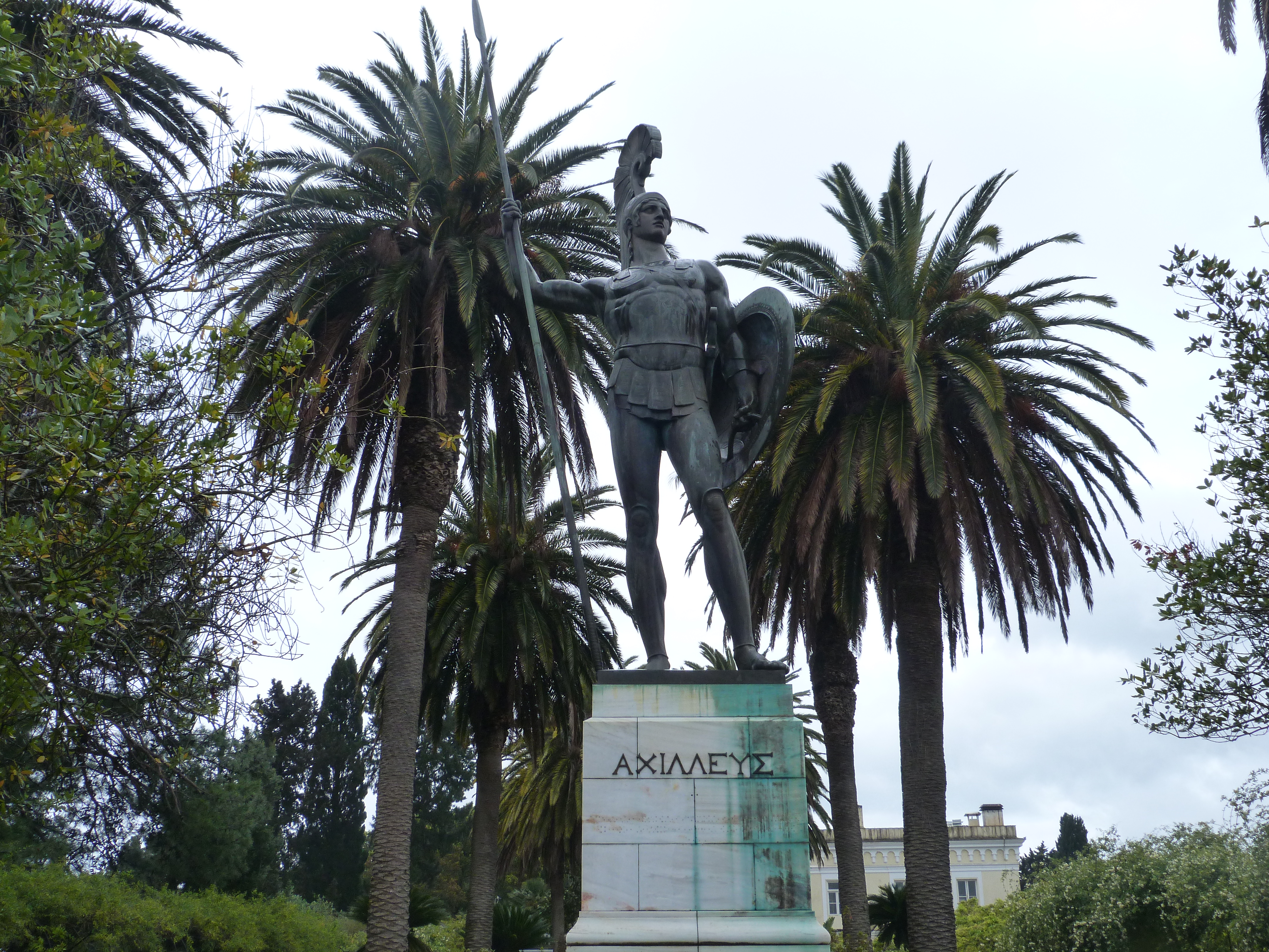 Als Kaiser Wilhelm II. sich das Anwesen kaufte, verfrachtete er den sterbenden Helden an eine andere Stelle und ließ sich einen angemessenen Achill herstellen, heroisch und siegreich. Der musste zerlegt nach Korfu gebracht werden, ein wahrer Riese. Als er endlich stand, in seiner ganzen Pracht, lud der Kaiser die Korfioten zur Bewunderung ein. Die konnten zunächst nichts damit anfangen, überlegten aber, dass es ein Gott sein müsse. So viele Götter kannten sie aber nicht und auch nicht die deutschen . Sie einigten sich auf Martin Luther. Dass diese Anekdote wahr ist, weiß mein Reiseführer. Jedenfalls waren Helm und Speerspitze vergoldet, so das das Kaiserlein, wenn er mit dem Schiff ankam, schon vom Meer aus seinen Prachtbuben schauen konnte.