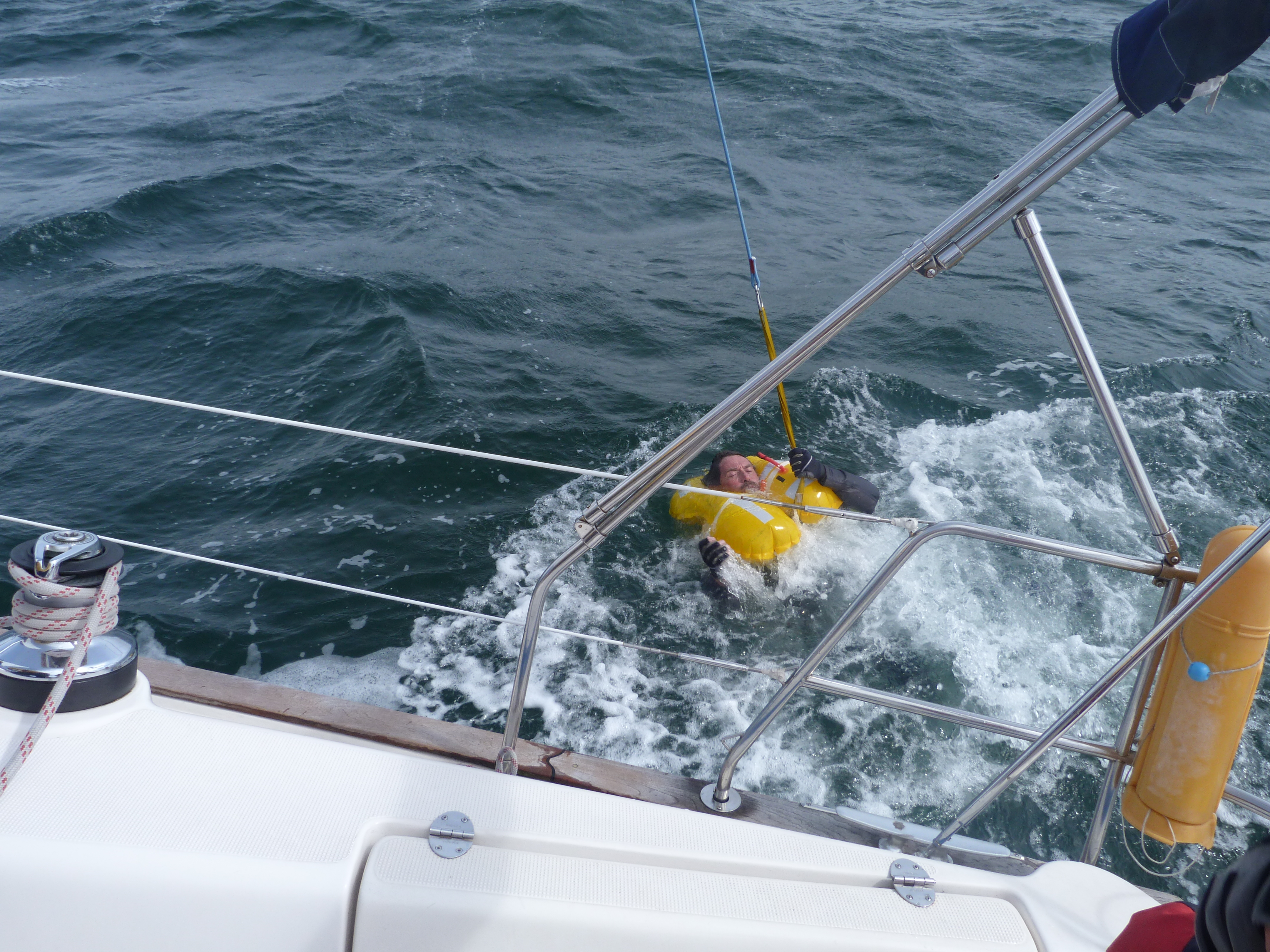 Nachdem wir im Vorgespräch an Bord unser bisheriges Rettungswissen auf dem Salontisch ausgebreitet hatten, kam auch „die Fock als Bergesegel“ auf selbigen. Einschätzung: unhandlich und viel zu groß (Seglfläche im Sturm), Geretteter kann zwischen langem Unterliek und Rumpf durchfallen. Also keine erfolgversprechende Rettungsvariante.