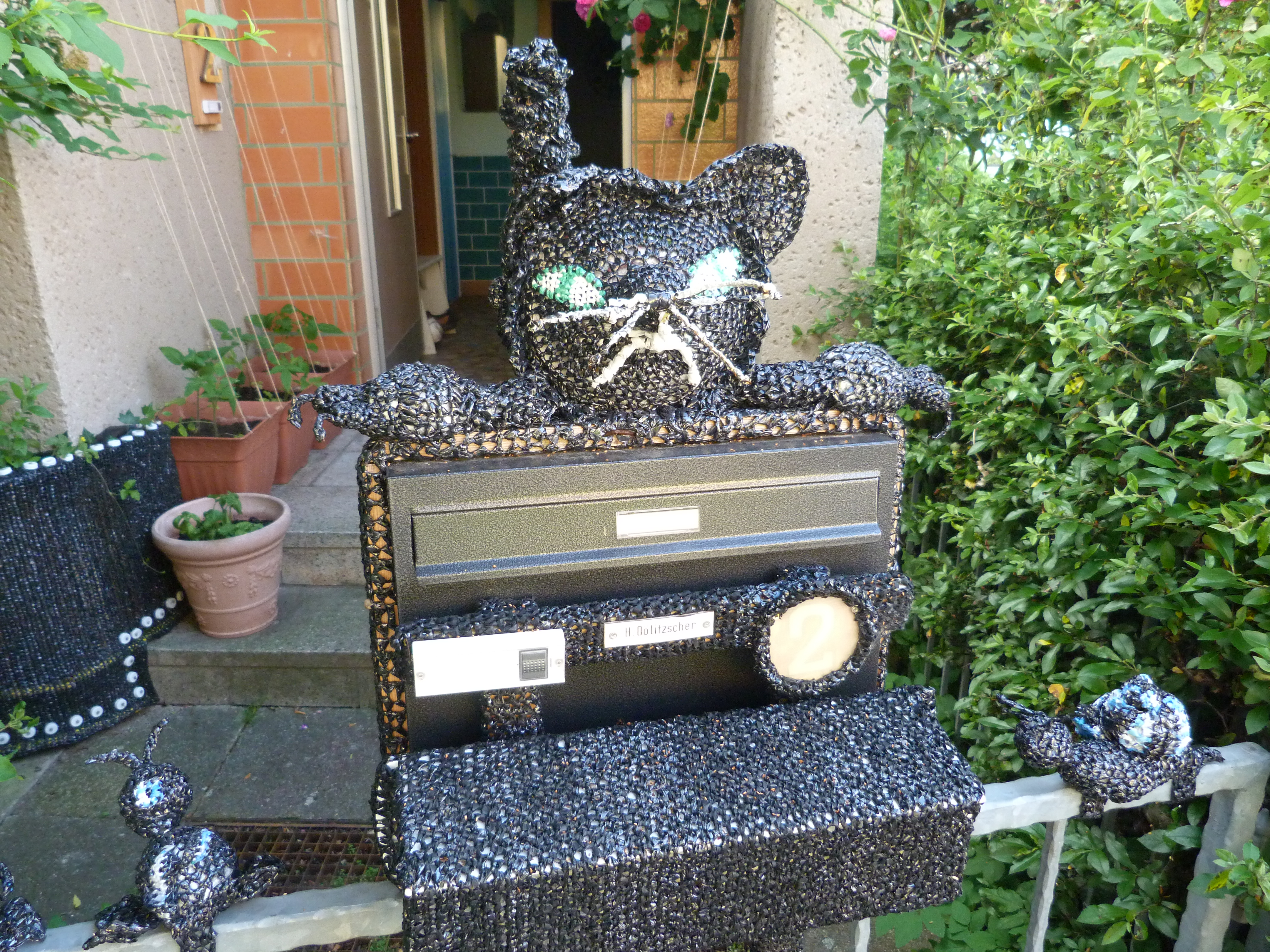 Ist sie nicht wirklich bestrickend, diese Briefkatzen-Katze?! Sie kann allerdings auch gehäkelt sein, das ist nicht so zu erkennen. Man darf nämlich nur kurz hinschauen, nur einen Augenblick, sonst zieht man sich in diesen eine unheilbare Krankheit zu, den Pupillenkrebs. Staunend blieb ich vor diesem Anwesen in einem idyllischen Dorf mitten im Thüringschen stehen, wollte schon klingeln, um nach weiteren Dekorationssünden zu fragen und das Innere zu besichtigen, doch mein Gatte zog mich unerbittlich weiter, er bräuchte jetzt dringend ein weiteres Bier oder auch besser noch zwei. Kulturbanause!