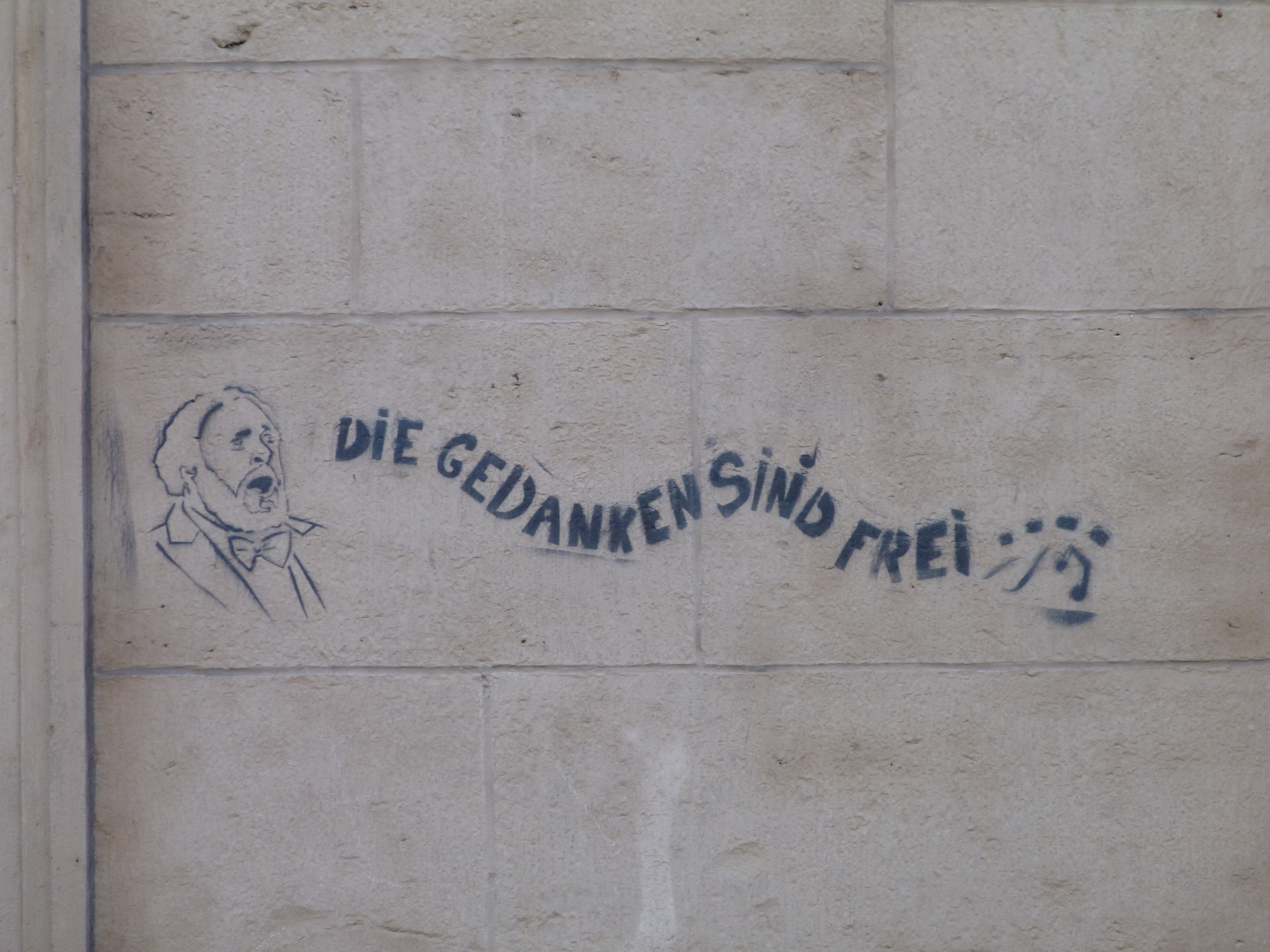 An einer Hauswand mitten in der Stadt eine bekannte und beliebte Liedzeile, geschwungene Schrift, seltsame Zeichen, sind das Noten? Der Herr, der es zu singen scheint, sieht aus wie Karl Marx. Ich sehe es, aber ich verstehe nicht wirklich. Was will uns der Künstler damit sagen? Vor 30 Jahren wäre ich begeistert gewesen, dies in der Öffentlichkeit zu lesen. Da hätte ich über die Bedeutung auch nicht lange grübeln müssen. Hätte meinen freien Gedanken ihren Lauf gelassen. Hilft mir jemand auf die Sprünge?
