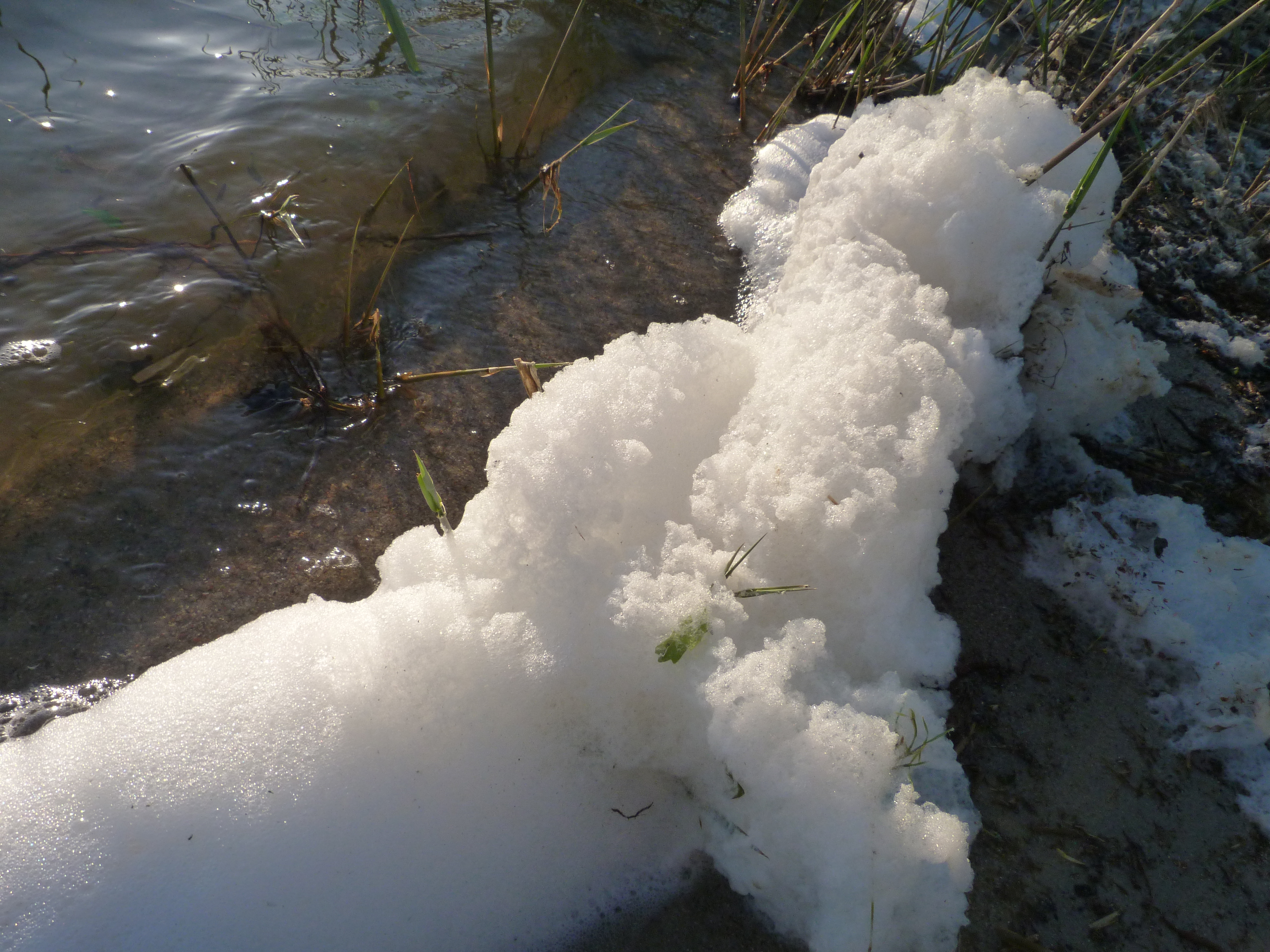 unserem Zelt, ein richtiger Schaumstreifen. Schon von weitem waren sie erkennbar, die Flocken wehten sogar einige Meter weit. Der See ist nicht sehr tief, etwas abseits der Havel und ziemlich trübe. Durch hohe Nährstoffbelastung kommt es zu sogenannten „Eutrophierungserscheinungen“: verstärkte Algenentwicklung, Wassertrübung, Sauerstoffmangel. Diese weiße Schaum entsteht durch das Zerschlagen der Algen und ihrer Eiweißstoffe, (wie beim Schlagen von Eiklar zu Eischnee). Der Schaum ist klebrig und riecht unangenehm (wenn man direkt mit der Nase drangeht) Er ist jedoch ungiftig. Schaumschlägereien des Windes am See.