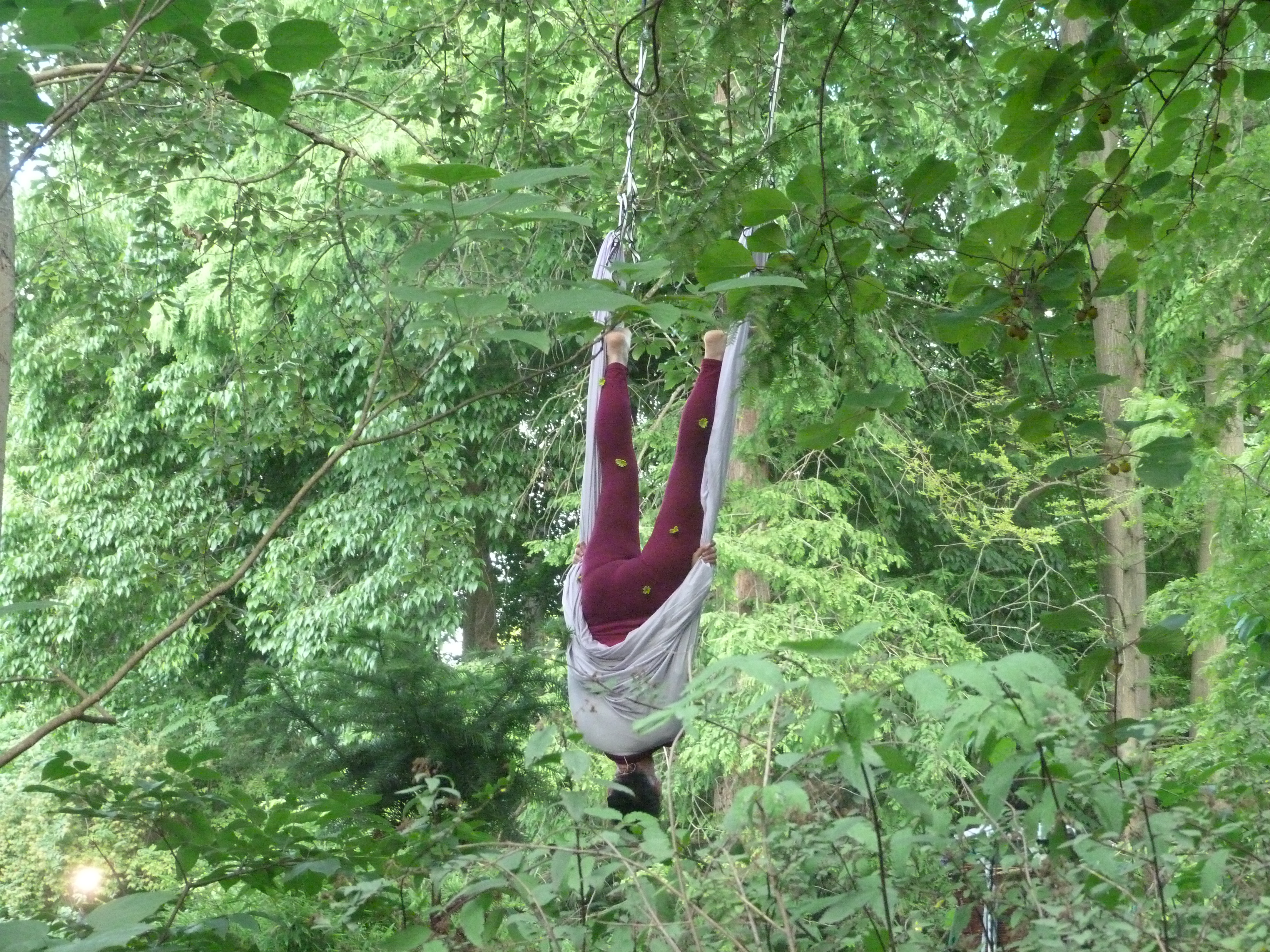Am anderen Ufer stand ein Cellist und oben im Baum erzählte es von den Pflanzen. Das liest sich im Programm so: „Hoch über dem Chinateich zwischen Mammut– und Pappelbaum schwebt im Yogatuch eine grazile Baumelfe und entführt uns in poetische Traumwelten.“ Die Bemerkungen der männlichen Begleitpersonen kann ich hier nicht wiedergeben, es hat jedenfalls mit dem Fettgedruckten zu tun.
