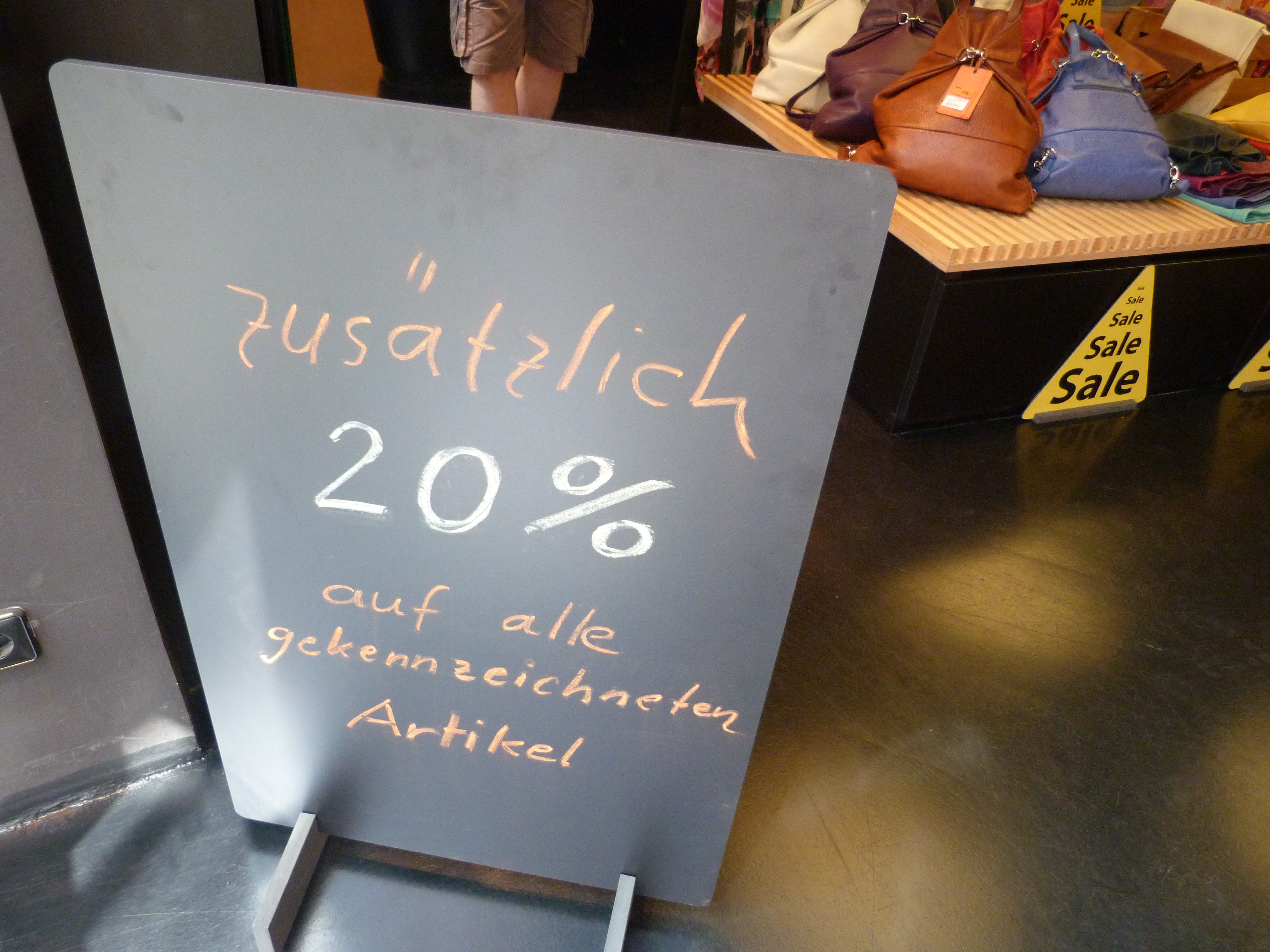 Die Berliner Geschäftleute wissen, wie sie dem gemeinen Touristen das Geld aus der Tasche ziehen, wenn er oder sie eine solche, aus echt veganen Leder kaufen möchte. Warum auch normale Preise zahlen? Wir jedenfalls amüsierten uns so prächtig vor diesem Schild, dass sich eine Verkäuferin genötigt fühlte, uns zu fragen, ob wir damit nicht einverstanden seien. War das etwa gar kein Gag? (Und ja, liebe Mathematanten und -onkel, ich weiß, dass die Überschrift nicht zur Tafel passt! Ich schreib sie aber trotzdem hin, weil ich nämlich kann!)