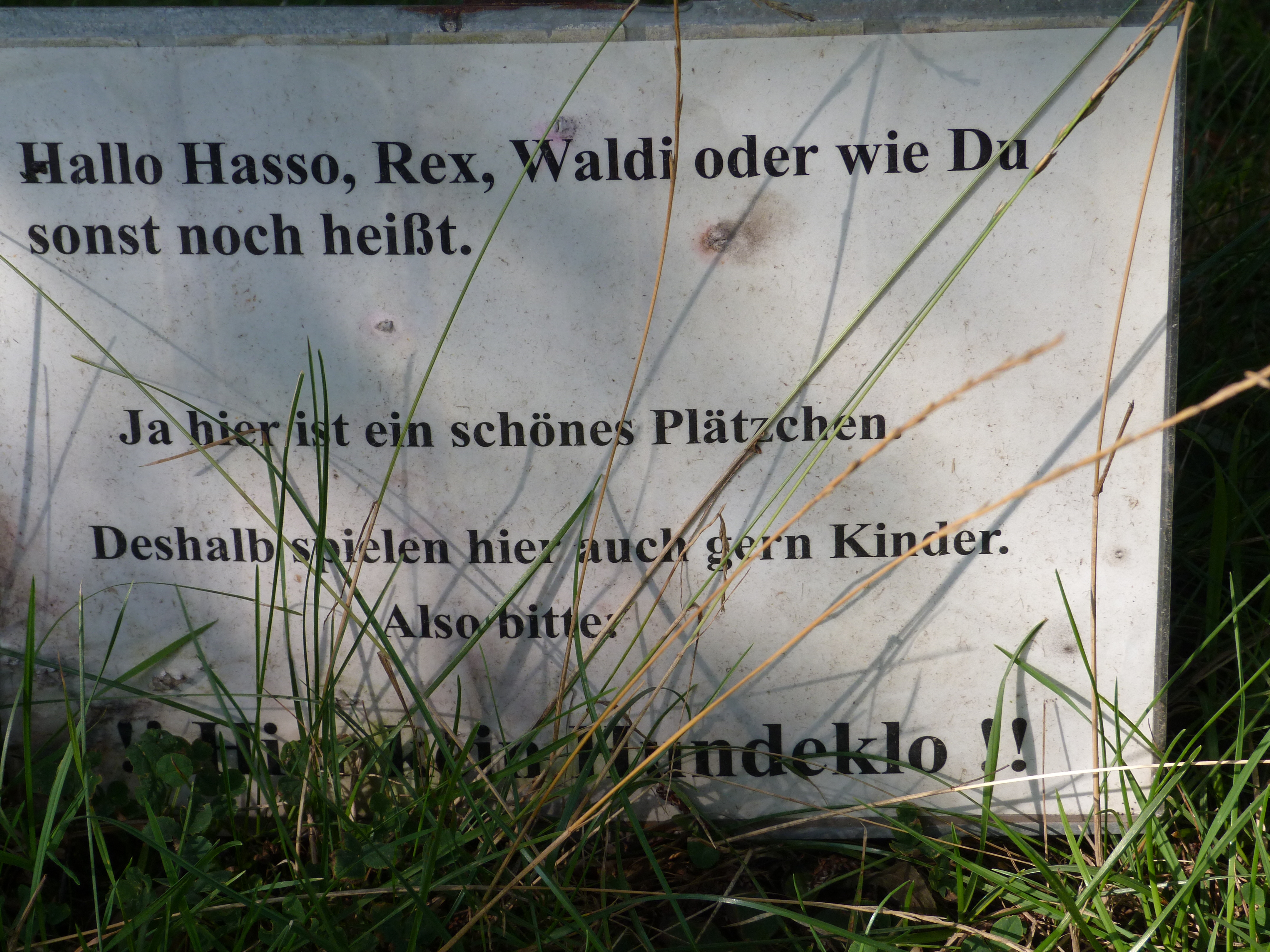 Als wir neulich unten auf dem Sandplatz Volleyball spielen wollten, mussten wir erst mal Kacke wegräumen. Jede Menge Kacke. Landete der Ball im Aus, stiegen wir über weitere Häufen. Ein kleines Hundchen kam angerannt, guckte sein von uns besetztes Klo an und rannte fünf Meter weiter in die Weitsprunggrube. Herrchen rauchte derweil seelenruhig auf dem Weg. Ringsrum freies Feld, Gebüsch, Bäume, jede Menge natürliche Hundeklos. Unser Geschrei interessierte weder Hund noch Herrn. Rücksichtslos! Allerorten scheint dies ein Problem zu sein, Schilder, die darauf hinweisen, gibt es häufig. Wenn aber Herrchen oder Frauchen auch nicht lesen kann?