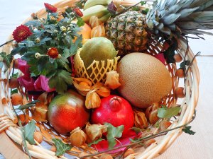 In jedem Supermarkt gibt es so viel Obst, dass die Auswahl schwerfällt. Von Wochenmärkten und speziellen Fruchtoasen ganz zu schweigen. Also: für einen Obstkorb als Geschenk braucht man nur zuzuschlagen, exotisch darf es ruhig sein. Ananas, Goldkiwi, Baby-Bananen, besondere Melonenarten, Mango, Physalis, Grapfruit, Granatapfel…. gerne auch etwas aus dem Garten dazwischen. Eine kleine Blühpflanze passt auch, oder ein herbstliches Kräutersträußchen. Ein Korb findet sich in jedem Haushalt, glaube ich, oder in diversen Pfennigläden. Ein wenig Efeu oder andere Ranken drumgeschlungen, ein paar Schleifchen – fertig. Für diesen Obstkorb auf dem Foto habe ich drei Minuten gebraucht, um alles zu drapieren. (Einkaufen vorher) Kostenpunkt: etwa 15 Euro.