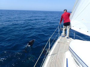 Der Nebel wurde immer dichter, wir hielten zu zweit Ausschau, nach allen Seiten. Die meisten Fischerboote senden keine AIS-Signale, und sowieso fahren sie kreuz und quer. Auch die Fischerstäbchen waren erst in einem Abstand von 10 Metern zu sehen. Obwohl es nicht kalt war, zogen wir doch unsere Segeljacken an und die Kapuzen über den Kopf, denn der Nebel regnete am Baum auf uns herab, alles war ziemlich schnell nass und es tropfte unaufhörlich. Je weiter wir uns vom Land entfernten, desto besser wurde die Sicht. Weit und breit keine anderen Schiffe zu sehen. Dafür hatten wir im Halb-Stunden-Takt Besuch: Ganze Delfinschulen begleiteten uns immer mal wieder. So ein Geschubse! Wir sahen auch zum ersten Mal Delfine zusammen jagen, sie schwammen im Kreis, sprangen und klatschen ins Wasser, in der Mitte brodelte es. Und die Vögel stürzten sich pfeilschnell ins Wasser und jagten mit. Bisher kannten wir das nur aus Dokumentarfilmen. An diesem Tag sahen wir das zwei Mal, einmal segelten wir sogar mitten durch, die Delfine unterbrachen ihr Mahl und sicherten sich ab, dass wir wieder verschwinden. Etwa eine Meile geleiteten sie uns, dann jagten sie weiter. So hatten wir den ganzen Tag viel zu sehen, wenn auch kein Land.