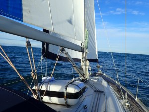 Laut Wetterkarte gab es nur diesen einen Vormittag, um mit „weniger“ Welle und „weniger“ Wind loszufahren. Weit sollte es ja nicht gehen, nur in den nächsten Hafen, dort gibt es einen Travellift. Also warfen wir zum Sonnenaufgang die Leinen los und wagten uns aus dem geschützten Hafen, in dem unser Boot seit August sicher lag. Schöner Wind, natürlich aus Nord, wo wir hinwollten, die 1,50 m Welle kam aber aus Nordost. So segelten wir gerefft hinaus auf den Atlantik, die Sonne wärmte auch etwas. Mit den vielen Kleidungsschichten, die wir trugen, kamen wir uns vor, wie im April auf der Ostsee. Nach zwei Stunden fuhren wir eine Wende, wenig später rummste es ziemlich laut und die frisch gewartete Rettungsinsel sprang aus ihrer Halterung und wollte von Bord, blieb aber an der Reeling hängen. Es war nicht so einfach, sie ins Cockpit zu hieven, mit Seilchen und Winsch klappte es dann doch noch. In dieser Zeit frischte der Wind auch merklich auf und die Wellen veränderten sich. Da mir immer noch die Salami vom Frühstück nach oben drängte, bestand ich darauf, jetzt den direkten Weg zu nehmen. Motor an, Segel rein und gegenan. Noch zwei Stunden, dann endlich die Hafeneinfahrt, in der ganz schön Welle stand. Als wir fest am Steg lagen, kam auch wieder die Sonne raus und im Windschatten war es sehr angenehm. Am nächsten Morgen dann fuhren wir ans Ende des Hafens zu Kran. Alle Marineros machten einen sehr kompetenten Eindruck und das Herausheben und an Land stellen klappte reibungslos,der Rumpf wurde auch gleich sauber gemacht. Jetzt gehen wir über eine Treppe ins Boot und könne auch das Meer, nicht nur eine Mauer sehen, inklusive Sonnenuntergang. Dafür steht das Schiff auf dem Trockenen. Allerhand Arbeiten stehen an, die bis Ostern erledigt sein sollten, denn dann wollen wir weiter, nordwärts.