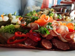 Vom Kuchenbuffet geht es zwanglos zum Abendessen über. Dazu werden als erstes die Teller richtig vollgeladen, damit man wenigstens von allem eine Kostprobe hat. Das Leeren der Teller in den Magen gestaltet sich schwieriger als mit den Augen. Allgemeines Bedauern, nicht mehr zu schaffen.