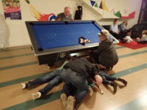 Spielen geht immer. Und da dieser Neunzigste in einem Jugendclub gefeiert wurde, wo auch sonst, gab es genügend Spielplatz. Hier sieht man unsere Versuche, mit den Billardregeln vertraut zu werden. So können auch richtig viele Altersstufen gleichzeitig spielen.