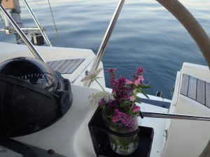 Klar ist auch, dass der Kompass gewürdigt werden muss. Zu diesem Zweck gibt es unmittelbar daneben eine Blumenvase. Zur Not kann man auch ein Bier dort haltern, kommt darauf an, wer am Steuer stehen will. Das ist sehr oft der Autopilot. Und der besteht auf frisch gepflückten Blumen.
