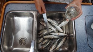 alternativ auf dem Markt gekauft werden. Dummerweise muss er gesäubert werden, und dass ist eine Sauerrei. (Legendär der mit einem Messer an Deck festgepickte, vor sich hin blutende Hecht in Schweden, nicht wahr!?) Mut antrinken hilft. Interessant: diverse Schuppen, die man noch Wochen später an seltsamen Stellen auf dem Schiff wiederfindet, glänzen sehr schön. Man erkennt sie am Geruch. Dann heißt es: Klar Schiff!