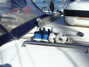 Ein Schuhregal ist auf dem kleinsten Deck, doch leider gibt es keine Schuhputz-App. Also stellen wir unsere Schuhe mal so hin, wie man es in Filmen sieht. Also von Hotels, wo die Schuhe vor der Zimmertür geputzt werden. Hat das eigentlich schon mal jemand wirklich erlebt? Im Sommer haben wir bei anderen gesehen, dass sie ihre Schuhe vor Betreten ihres Schiffes in einen Eimer Wasser tauchen. Kakerlakenschutz.