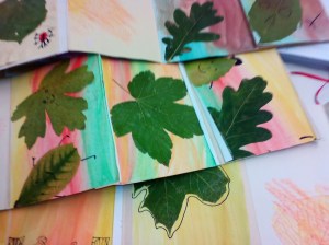 Im Herbst haben die Fünftklässler auf dem Schulgelände Blätter von verschiedenen Bäumen gesammelt und sie sorgfältig in 8 kleine Pressen gelegt. Diese wollten die Naturwissenschaftslehrer nicht gebrauchen, da nicht für jeden Schüler eine solche vorhanden sei und so habe ich sie für Kunst requiriert. Ein paar Wochen später haben wir diese Blätter aufgeklebt, verziert, umrandet, durchgedrückt (Frottage!) und allerhand verschiedenen A4 Blätter