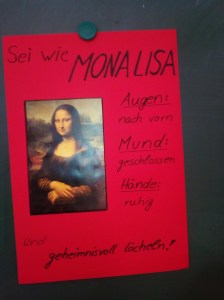 Das mit der Ruhe im Kunstunterricht ist so eine Sache. Wenn die Kids wissen, was sie tun, können sie sich nebenbei unterhalten, es muss also nicht totenstill sein. Oft lasse ich Musik laufen, stelle den kleinen Lautsprecher auf den Schrank oder hinten ins Regal. Ist lustig, wenn die eine oder andere beim eigenen Lieblingslied mitsingt. Die oberen Klassen dürfen ihre Ohren einstöpseln und eigene Hottentottenmusik hören. Wenn ich dann doch mal die Aufmerksamkeit brauche? Rumschreien und rumhampeln sind irgendwie unangenehm, für alle. Ich versuche es jetzt mit einem kleinen Plakat, welches ich dann an die Tafel hänge. Für diejenigen, die partout nicht mitbekommen, dass alle anderen jetzt geheimnisvoll grinsend ruhig sind, habe ich ja noch die Peitschen-App!