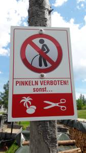 Leserin R. aus T. traf dieses Schild und sendete es mir, herzlichen Dank! Es ist ja eindeutig keine richtige Männertoilette und richtet sich wohl an die Wildpinkler. Wie neulich im Stau auf der Autobahn, als im Minutenabstand sich die Männer am Straßenrand erleichterten und seltsamerweise alle an der einen Stelle am Gebüsch standen, obwohl es mehr günstige Stellen, uneinsichtigerer, gab. (Hier spricht aber nur der Neid aus mir, denn mir war es unmöglich, für alle sichtbar zu pullern.) Zurück zum Schild: Seht ihr auch vor eurem geistigen Auge in der Nähe jemanden mit Schere lauern? Oder hängt gar unter dem Schild ein geeignetes Werkzeug für Selbstabholer Selbstbestrafer? Kopfkino.
