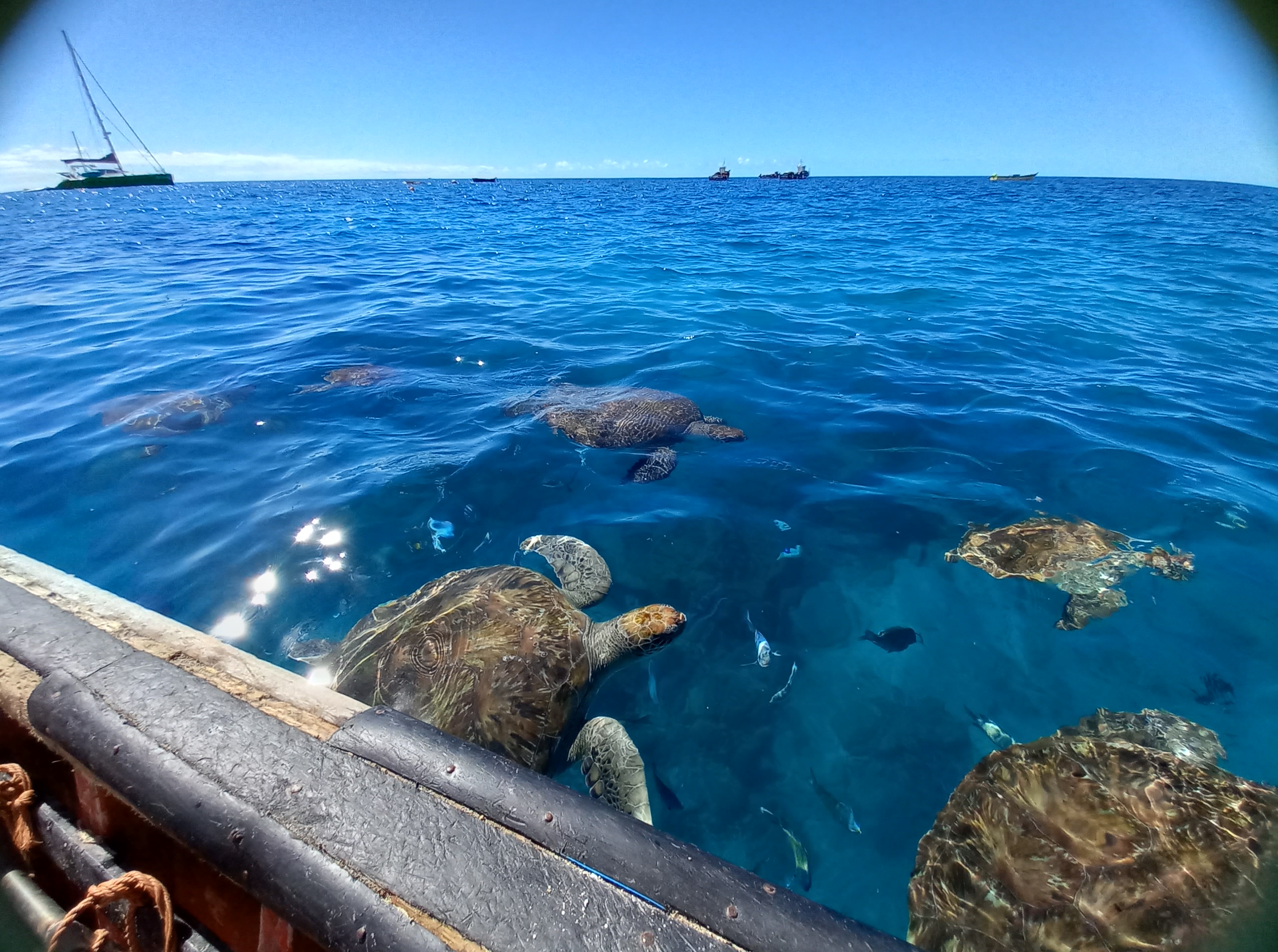 Der Strand ist leer, das Wasser türkis, klar und warm und wir lassen uns von zwei Einheimischen in ihrem Holzboot zu den Schildkröten fahren. Zu unserem Erstaunen stoppen wir schon zwanzig Meter vom Ufer entfernt, es wird etwas Futter ins Wasser geworfen und schon wimmeln verschieden große Schildkröten um uns herum. Wir setzen Taucherbrille und Schnorchel auf und gleiten vorsichtig ins Wasser. Wir verharren an der Oberfläche, bewegen uns nur langsam, denn überall sind nicht nur Schildkröten, sondern auch die buntesten Fische, die auch futtern wollen. Genau unter mir die Schildröte ist mindestens so groß wie ich, ich ziehe den Bauch ein, damit er nicht auf ihrem Panzer rumhängt. Ist ja schließlich der Leader. Ich kann mich gar nicht satt sehen, doch langsam wird das Schnorcheln anstrengend. Mir fällt ein, dass ich es nicht schaffen werde, mich ins Boot hoch zu ziehen, doch die Guides haben schon eine eine kleine Leiter angehängt, so geht es. Schon fahren wir wieder zum Strand und helfen, dass Boot über den Sand zu ziehen. Wir sind immer noch voller Begeisterung, jedoch wird das Portmonee stark strapaziert, als der Obolus fällig wird. Merke: Vorher nach dem Preis fragen und verhandeln. Auch wenn es der Cousin des Fahrers ist. Doch gönnen wir den Kapverdis ihr Einkommen, viel haben sie ja nicht.