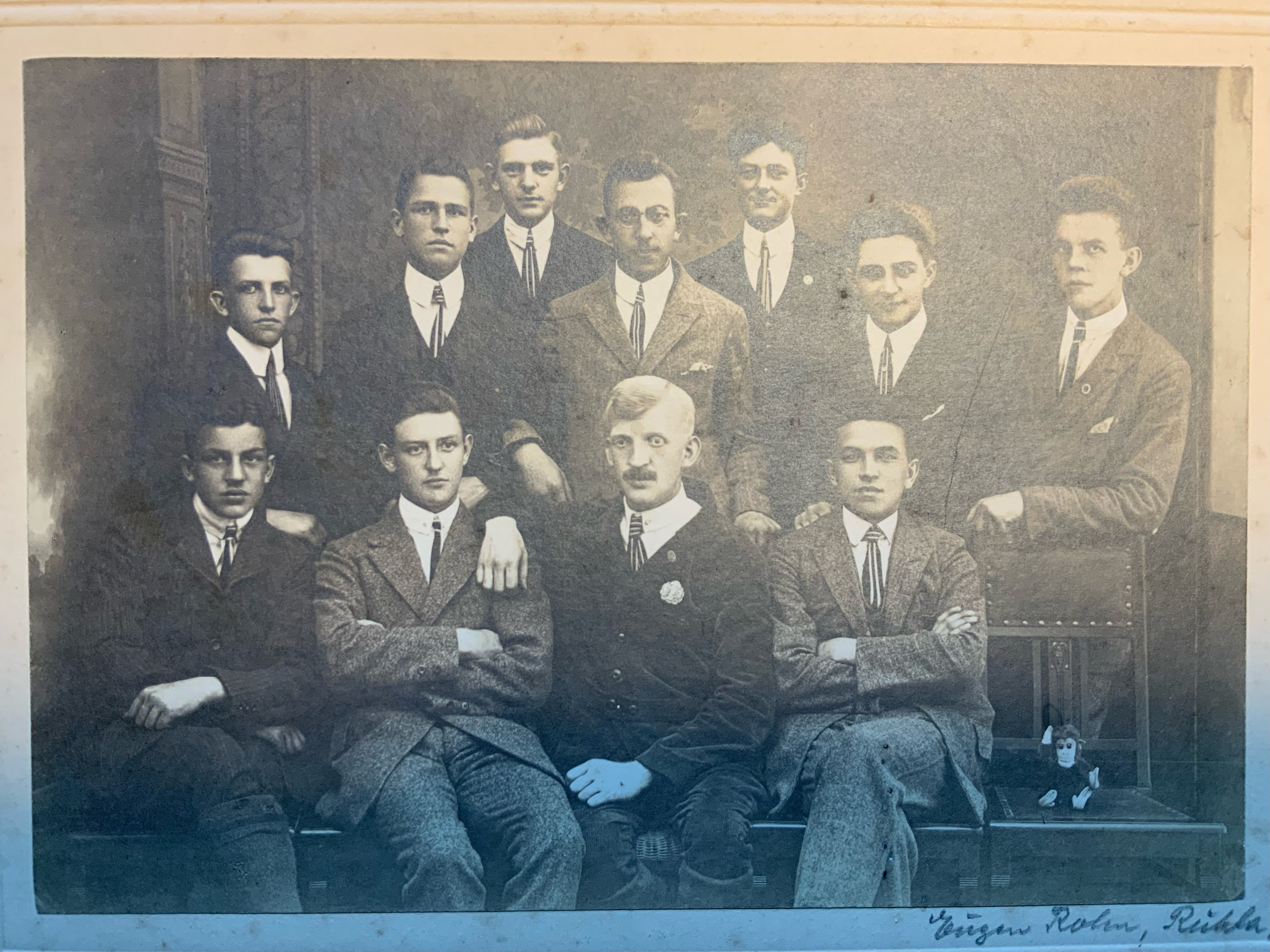 Ich wühle mich durch die Nachlasskiste mit alten Fotos, Feldpostbriefen, Abschriften, Urkunden und Dokumenten. Sie sind fröhlich durcheinander, ich nehme wahllos ein Papier in die Hand und entziffere mühsam alte Handschriften, Ein vergilbtes Papier kann ich gut lesen, mit Schreibmaschine geschrieben, leider ohne Datum oder Anlasss. Aber passend zu einer Gruppenfotografie, mit Onkel Otto vorne in der Mitte, als junger Mann. Also werde ich es hier genau so abschreiben:
