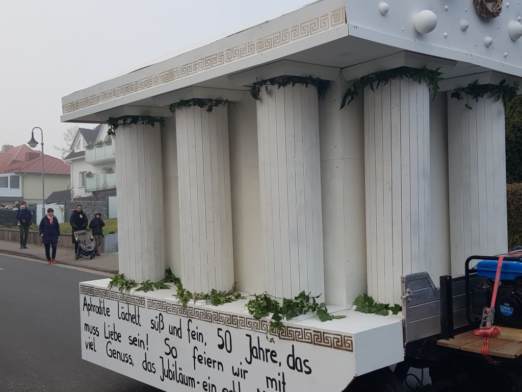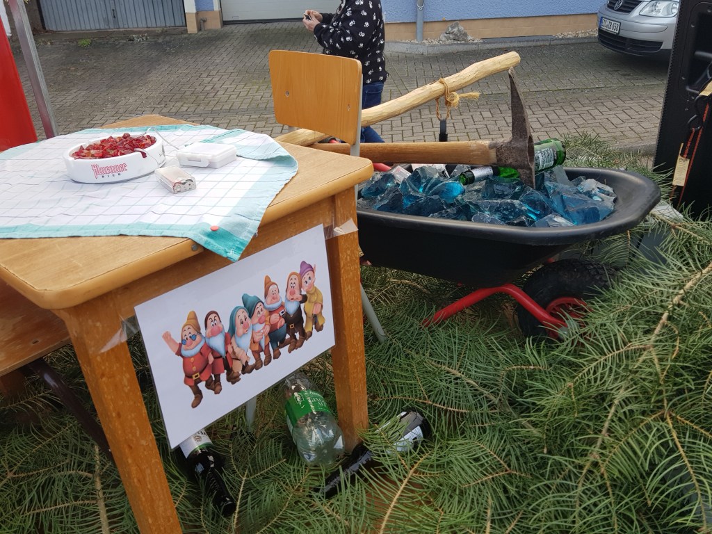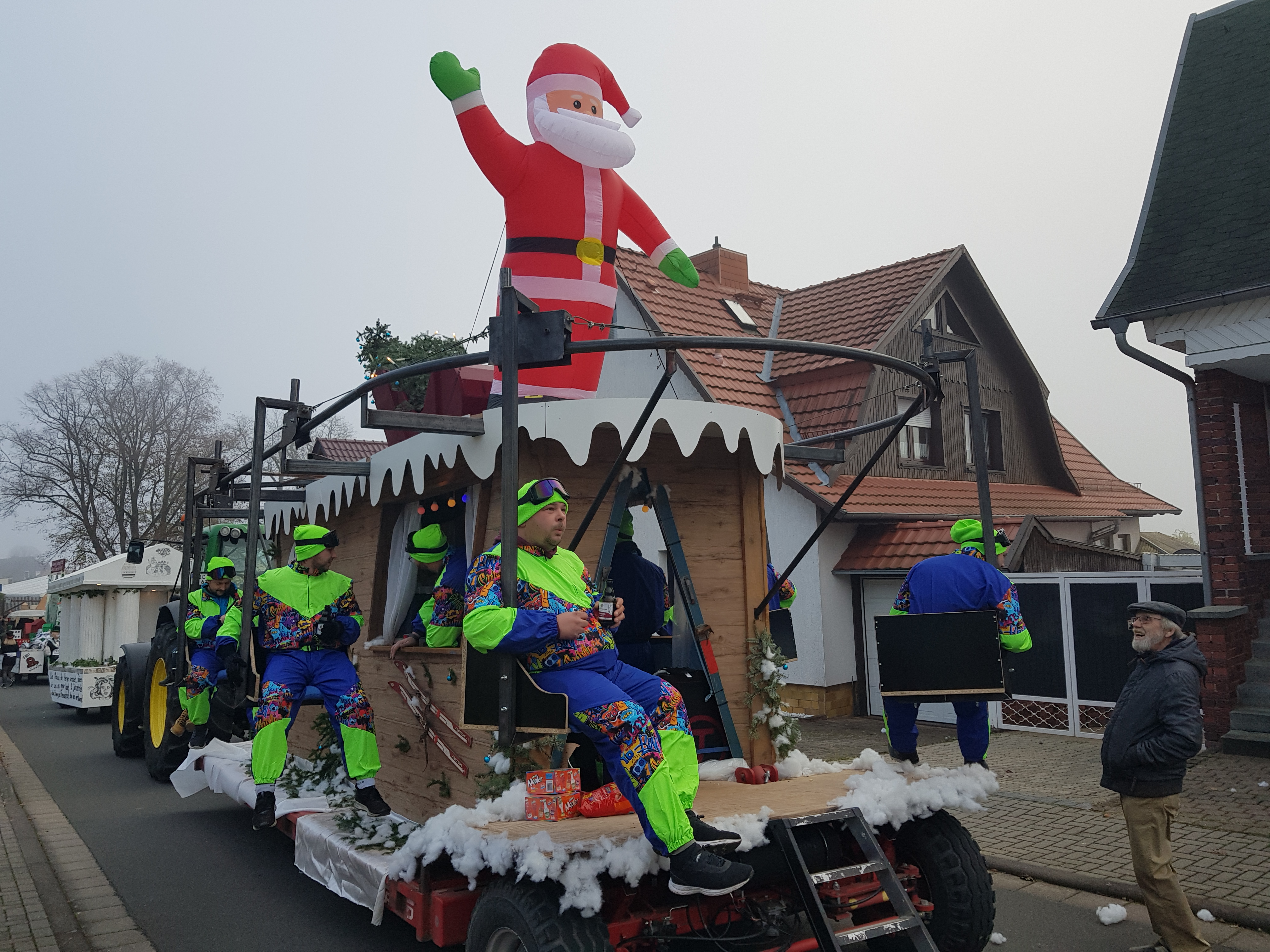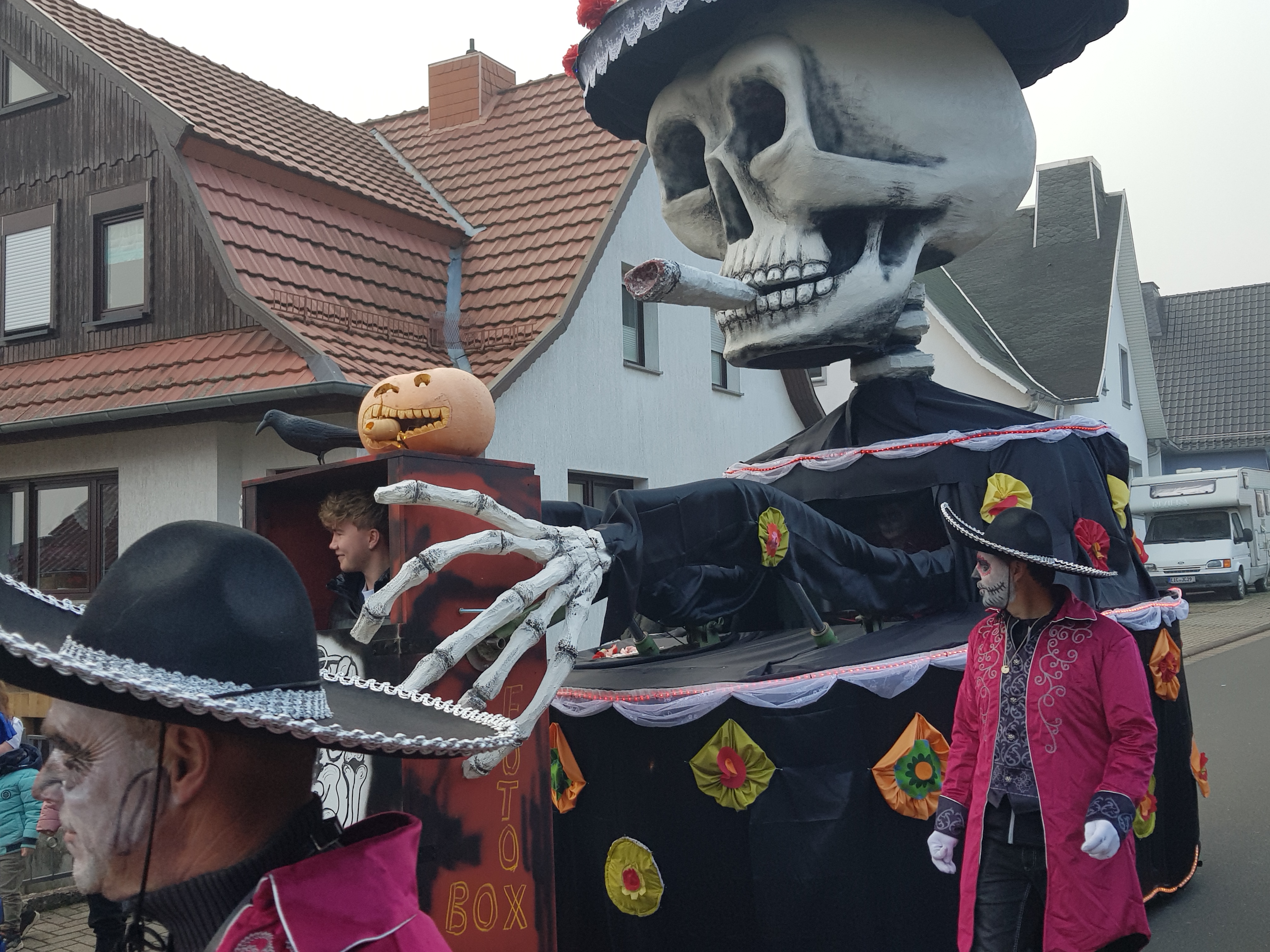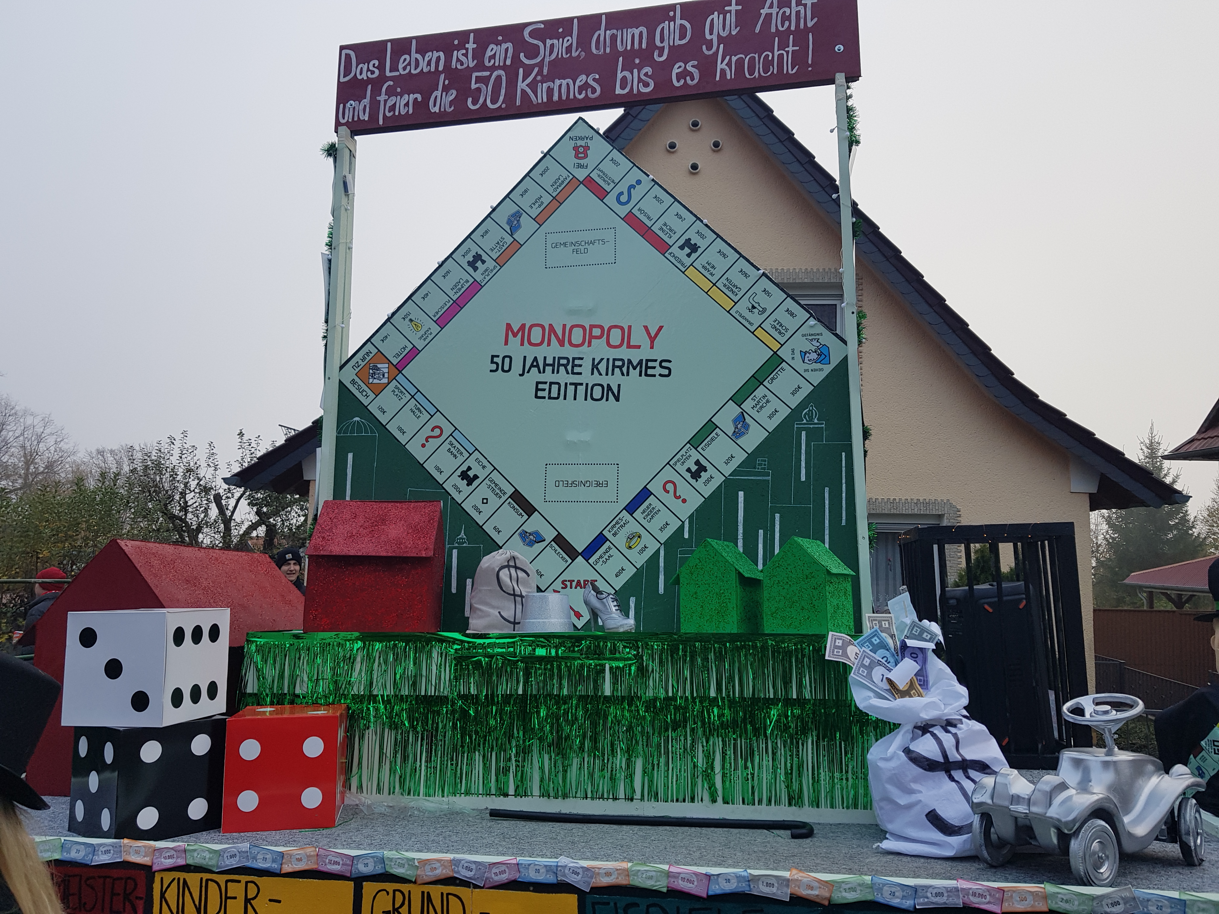 Was für ein Glück mit dem Wetter, nur neblig und kalt, kein Regen zum Umzug durchs ganze Dorf. Das dauert Stunden, wir scheinen ein großes Dorf zu sein. Gut, dass ich am Umzugsanfang in der Nachbarschaft stehe, hier sind alle noch nüchtern, selbst die, die Ständchen an verschiedenen Häusern bringen, gemeinsam einen Schnaps trinken, die Büchse mit Scheinen gestopft kriegen und dann weiterziehen. Es gab viele liebevollgestaltete und kreative Wagen (Treckerfahrer sind zur Kirmes immer sehr begehrt!) und wunderbar kostümiertes Fußvolk. Zum Jubiläum haben sich alle etwas besonderes einfallen lassen. Nur das mit den Reimen ist noch ausbaufähig!