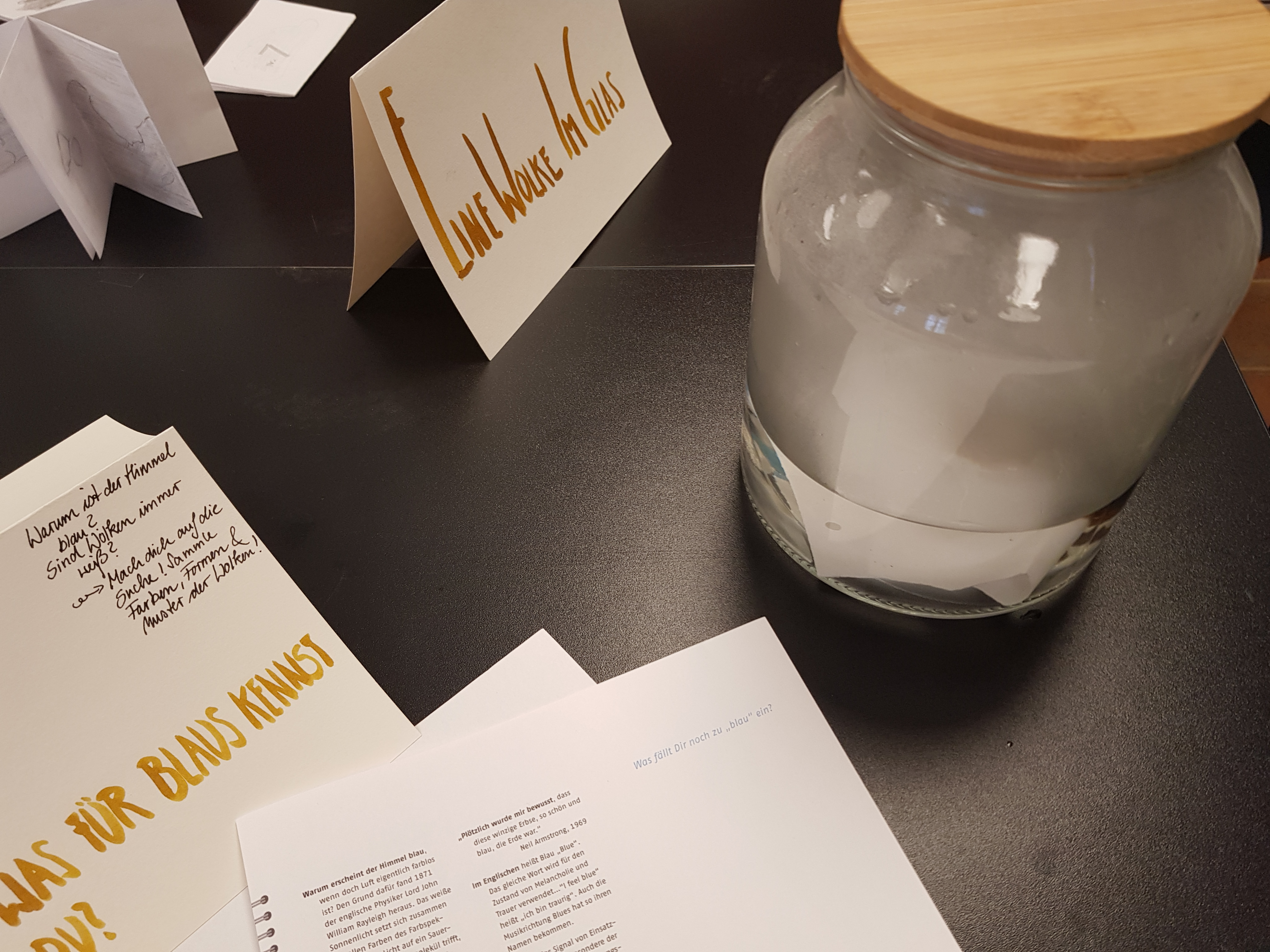 Letzte Woche bildete ich mich künstlerisch weiter, ich berichtete kurz. In einem Workshop erlebte ich, wie man sich ganz leicht eine Wolke im Glas machen kann. Also: ein großes Glas mit Deckel, schon ein wenig mit Wasser gefüllt, kochendes Wasser dazu, Deckel wieder darauf, etwas schwenken. Ein Stück Papier ankokeln, Deckel schnell auf, Papier rein, Deckel zu — eine Wolke im Glas!