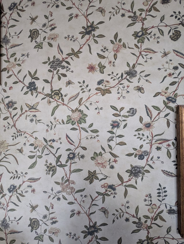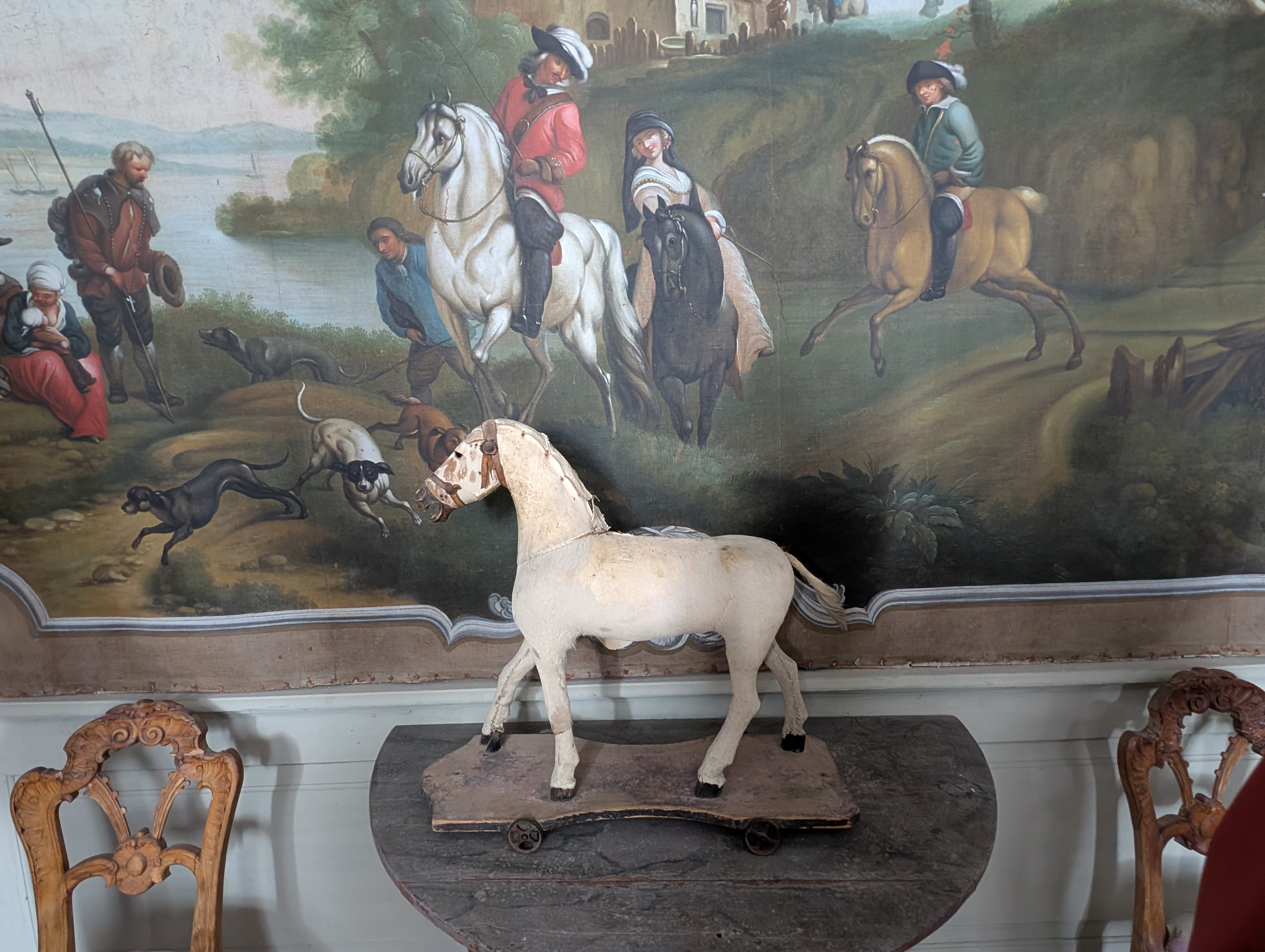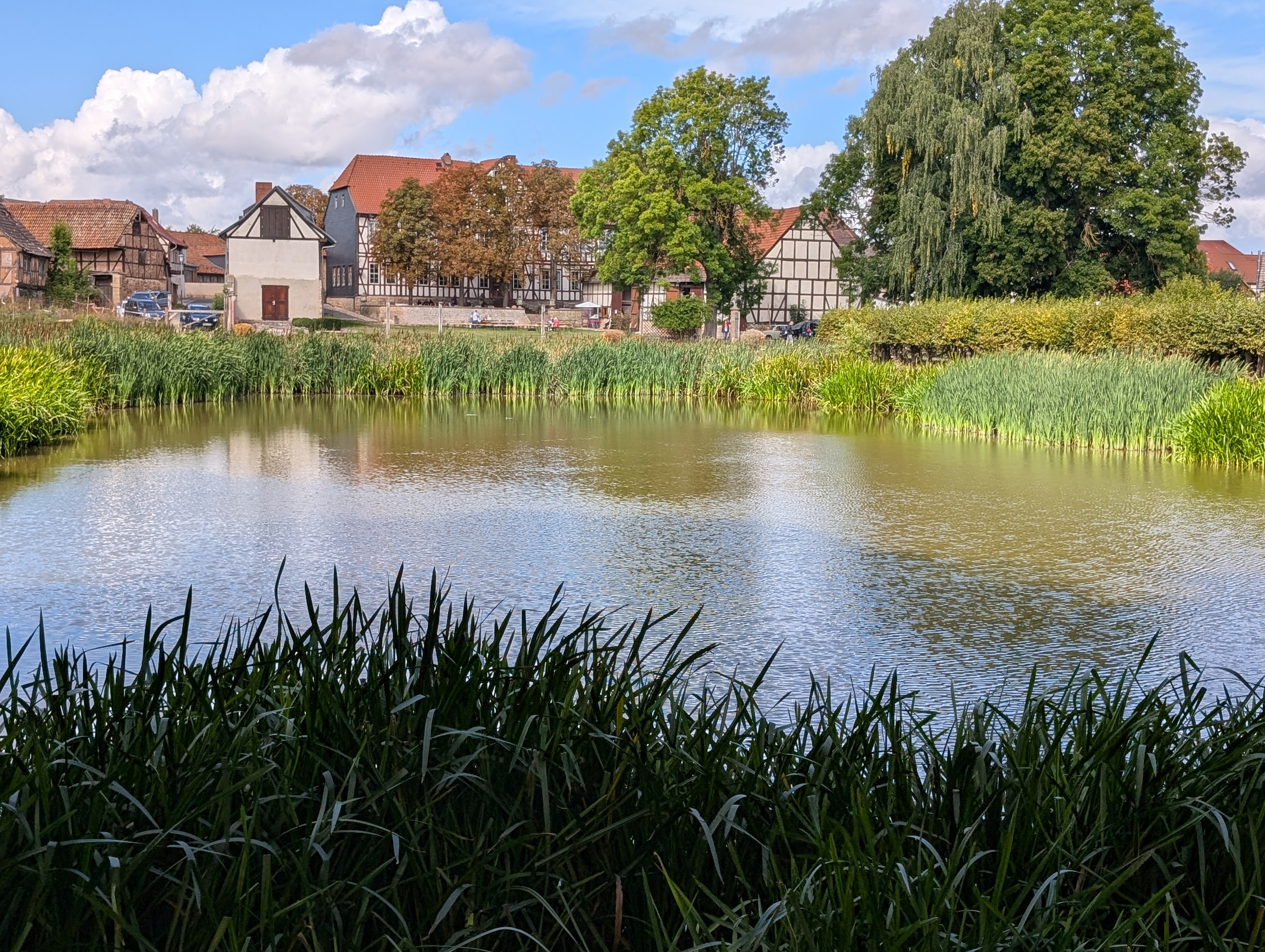 Das Navi führte uns umleitungsmäßig in völlig neue Gefilde und fremde Gestade. Wir kamen gerade recht zur ersten Führung des Besitzers durch sein (Gutshaus) Schloss. Wir staunten nicht schlecht und bekamen ein paar Einblicke in die Schwierigkeiten mit Behörden, Miterben, Auflagen und Widrigkeiten und natürlich zur Familie: „Das Rittergut in Wolkramshausen blieb bis zum Tod der letzten Bewohnerin Elsa Gräfin Hue de Grais 1956 im Familienbesitz. Nach der Enteignung in den 1980er Jahren wurde es mit Gerichtsbeschluss im Jahr 1996 an den Nachfahren Manfred Werthern restituiert.“ Besonders die vielen Wandbilder in den zwei Etagen, die wir besuchen durften, fielen uns Besuchern ins Auge und wir lauschten der einen und und anderen Geschichte dazu. Nach einem köstlichen Stück Torte spazierten wir noch durch den Park. Inzwischen habe ich auch nachgelesen, was wir fast vor der Haustür neu entdeckten: Schloss Hue de Grais.