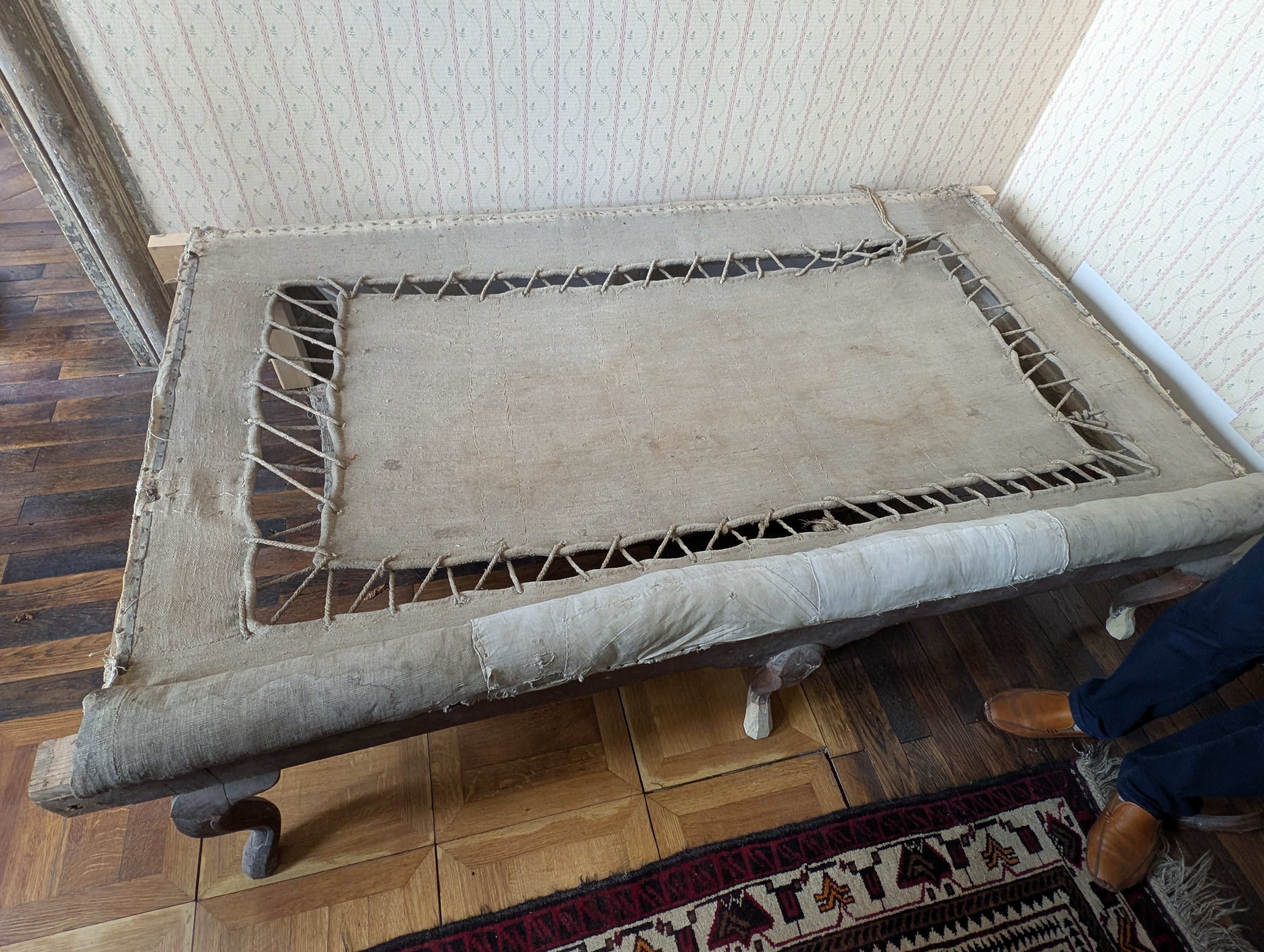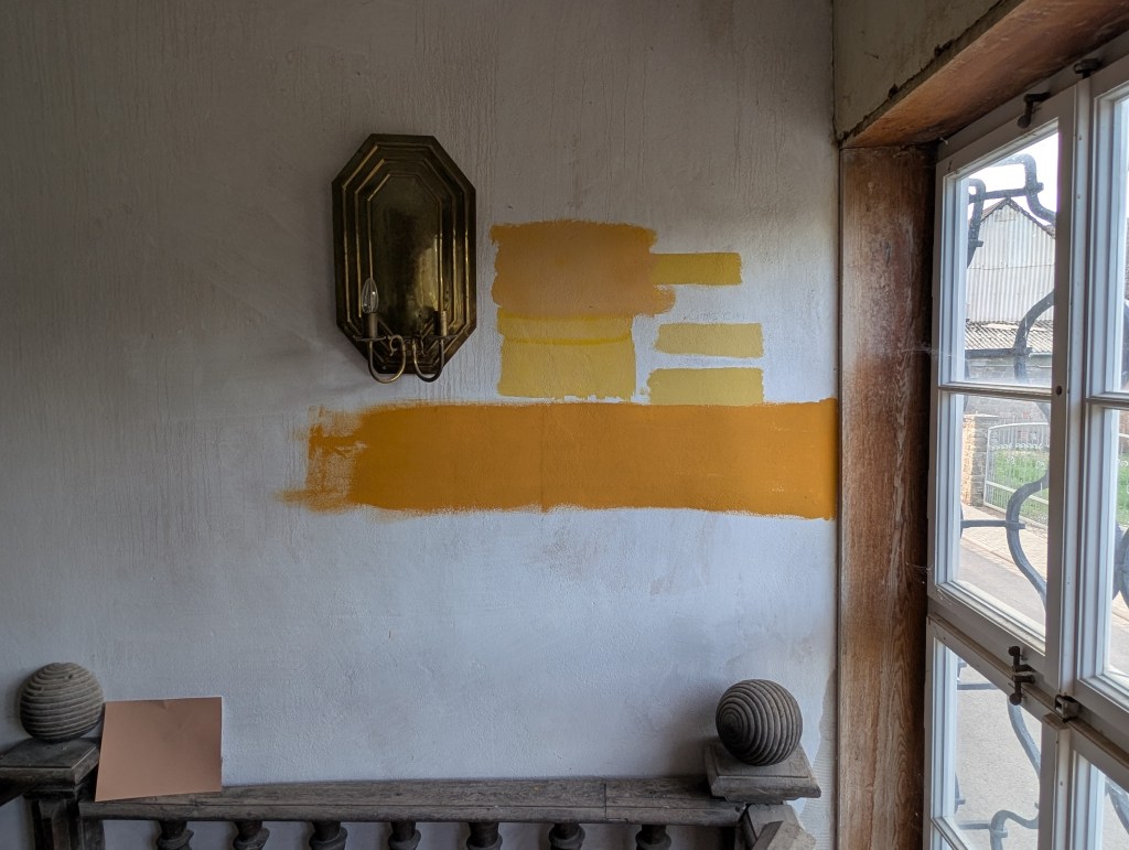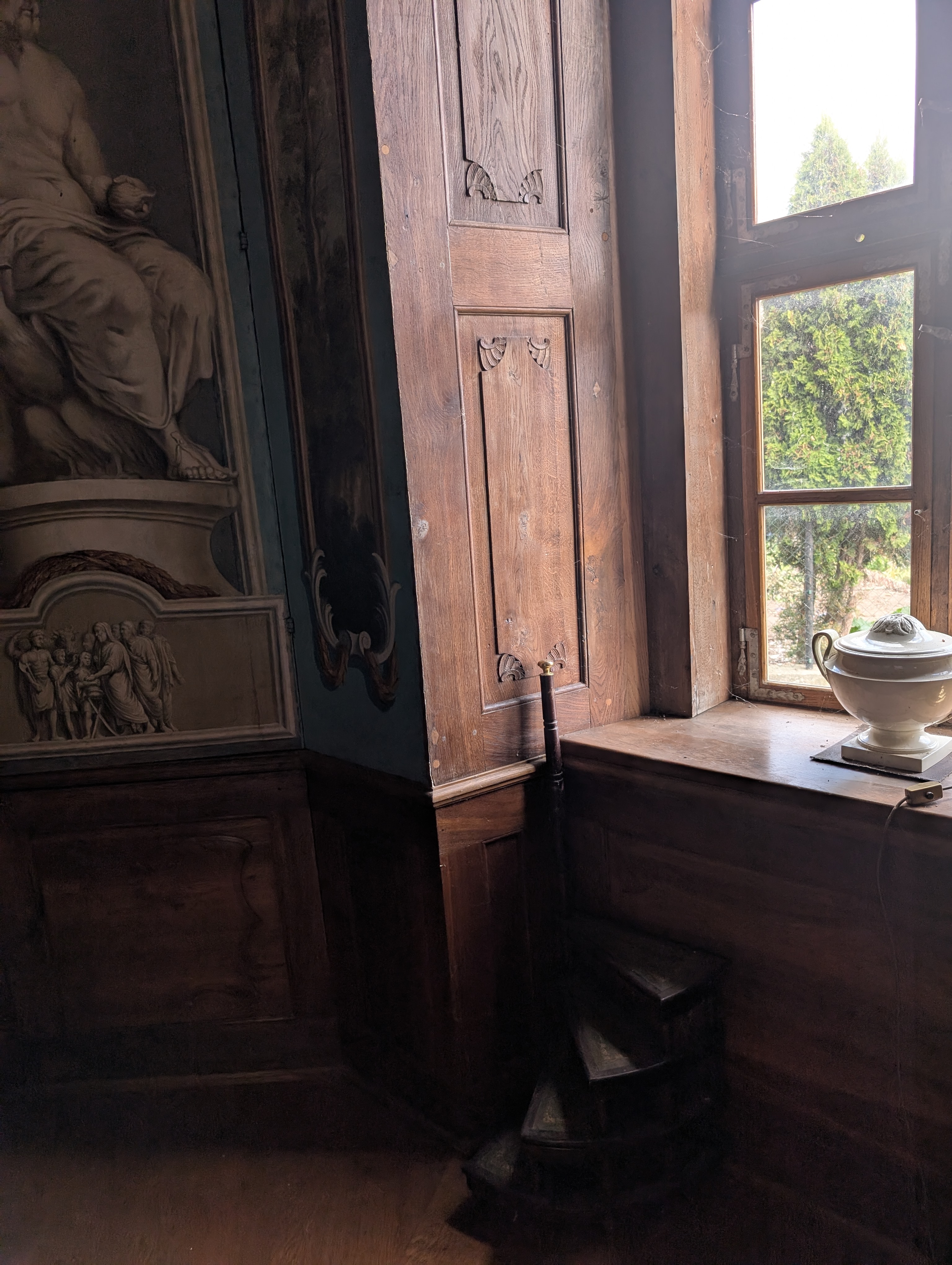 Das Navi führte uns umleitungsmäßig in völlig neue Gefilde und fremde Gestade. Wir kamen gerade recht zur ersten Führung des Besitzers durch sein (Gutshaus) Schloss. Wir staunten nicht schlecht und bekamen ein paar Einblicke in die Schwierigkeiten mit Behörden, Miterben, Auflagen und Widrigkeiten und natürlich zur Familie: „Das Rittergut in Wolkramshausen blieb bis zum Tod der letzten Bewohnerin Elsa Gräfin Hue de Grais 1956 im Familienbesitz. Nach der Enteignung in den 1980er Jahren wurde es mit Gerichtsbeschluss im Jahr 1996 an den Nachfahren Manfred Werthern restituiert.“ Besonders die vielen Wandbilder in den zwei Etagen, die wir besuchen durften, fielen uns Besuchern ins Auge und wir lauschten der einen und und anderen Geschichte dazu. Nach einem köstlichen Stück Torte spazierten wir noch durch den Park. Inzwischen habe ich auch nachgelesen, was wir fast vor der Haustür neu entdeckten: Schloss Hue de Grais.