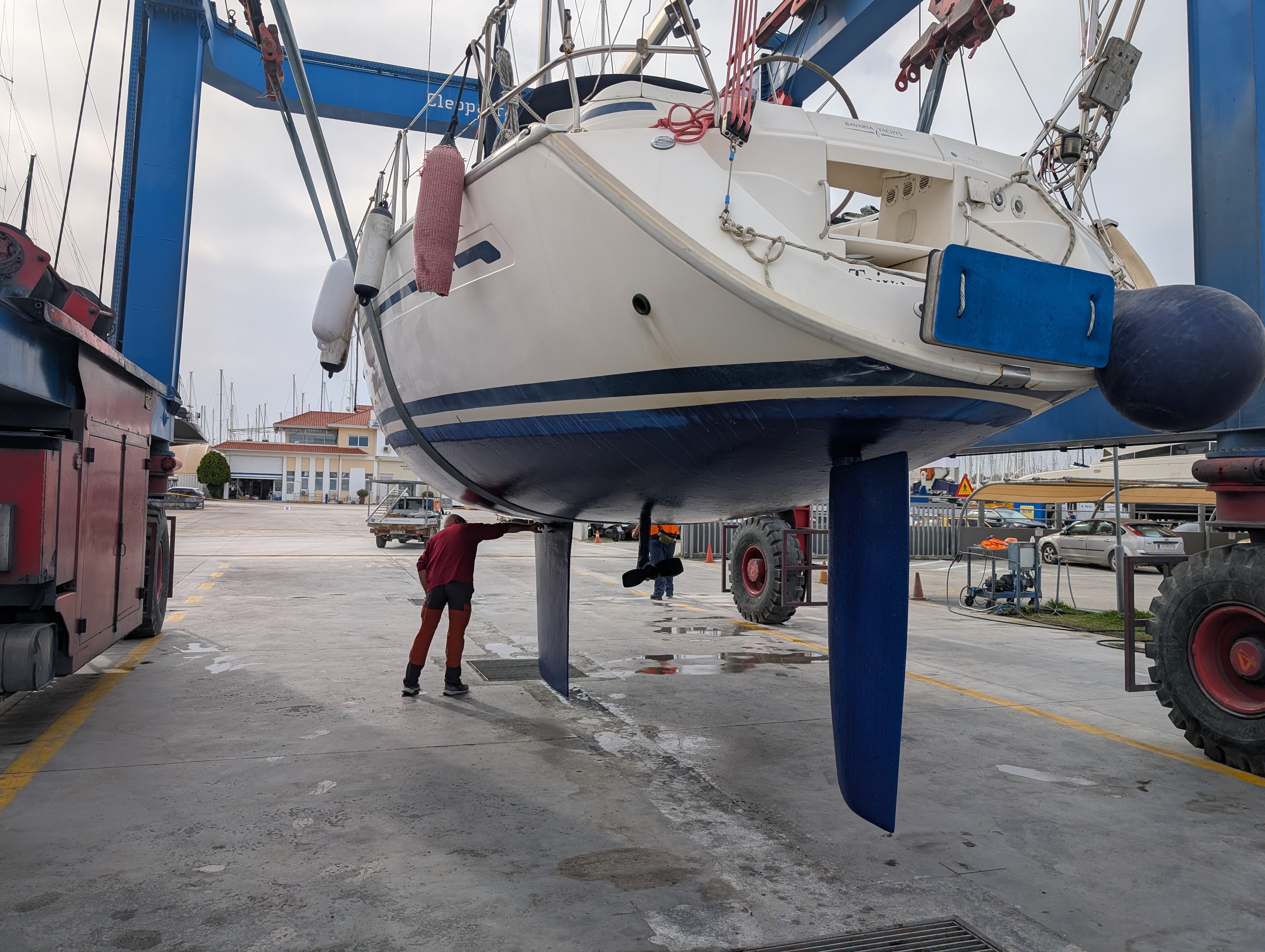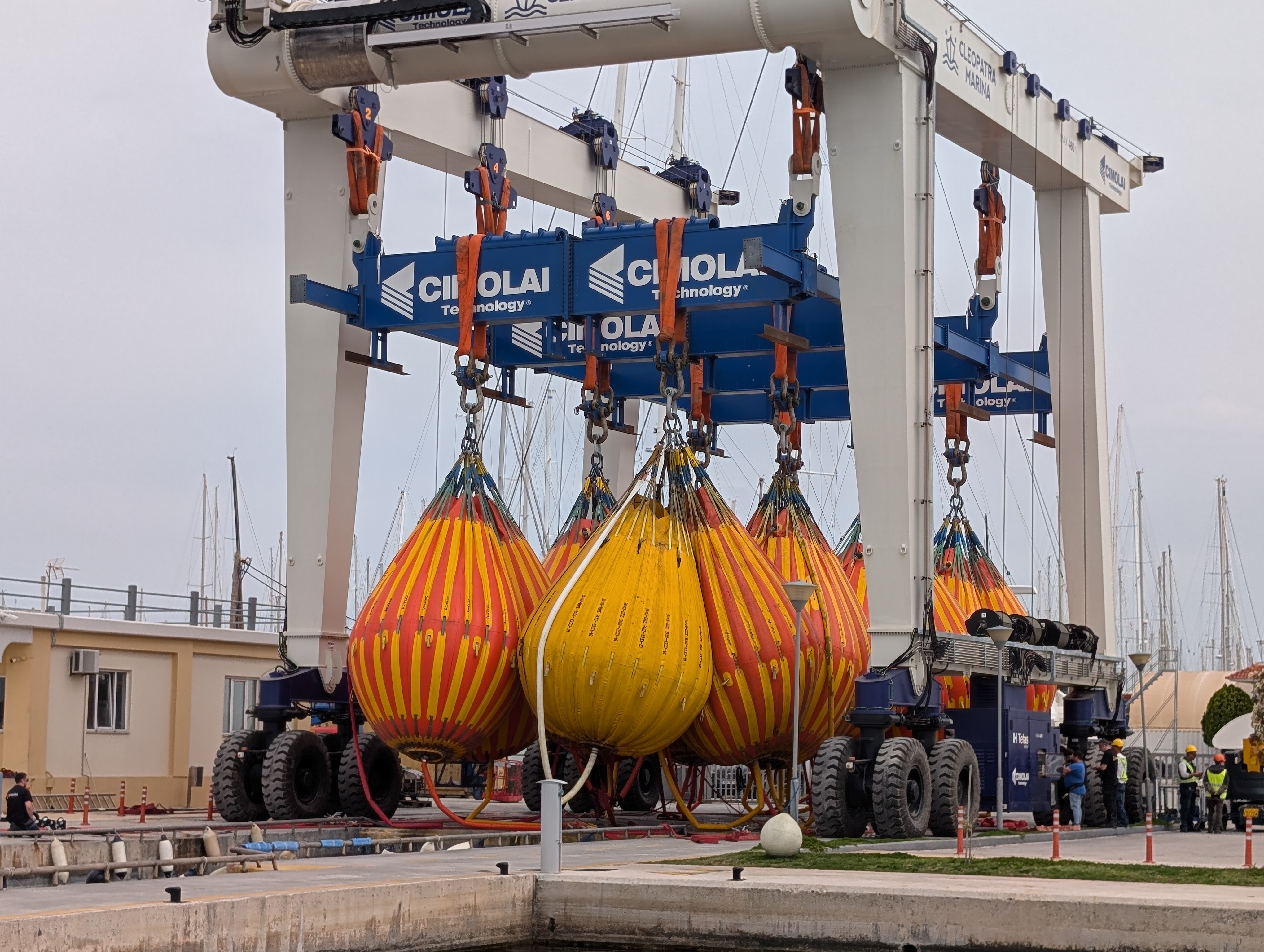 Bevor unser Krantermin nahte, beobachteten wir Seltsames, sozusagen aus der ersten Reihe. Den neuen, riesigen Kran hatten wir in der Marina ja schon gesehen, doch er musste wohl noch getestet werden!