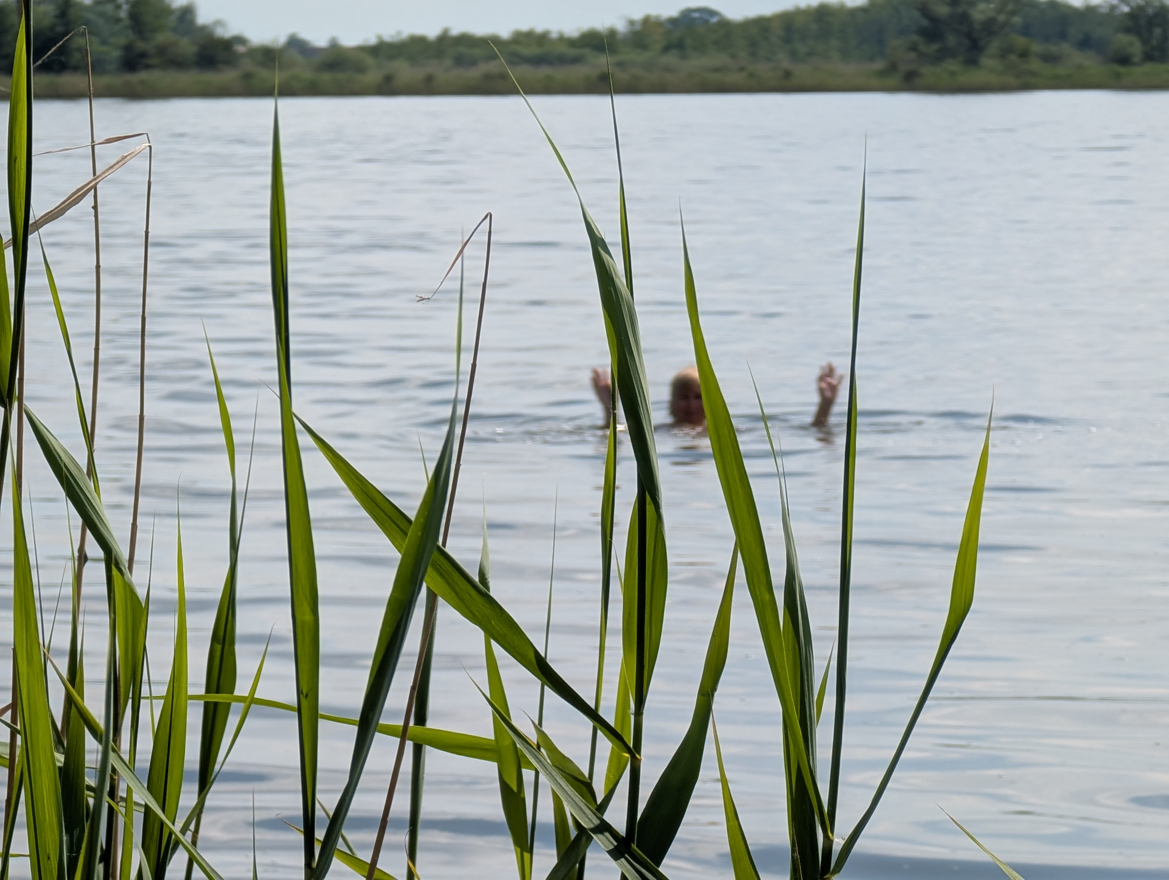 Das Zelt direkt am See aufbauen, gleich noch das Faltboot und nach einem wohlverdienten Abendessen paddeln wir auf die andere Seite des Campingplatzes, ins „Baggerloch“. (Obwohl wir mindestens das zwanzigste Mal hier sind, wissen wir erst jetzt diesen Namen!) Frösche, Gänse, Kuckucke und natürlich Teichrohrsänger, Drosselrohrsänger, Zwergdommel, Schilfrohrsänger…. Keine Mücken! Das heißt, wir sehen sie schon, doch es bläst ununterbrochen recht viel Wind über den See und sie davon. Der Wind wird uns die nächsten Tage begleiten, diesmal können wir auf dem Rückweg den Schirm als Segel aufspannen, unser Boot gleitet dahin… Doch zunächst wandern wir am ersten Tag um den See, es ist doch recht frisch und die Wellen sind uns zu hoch. 16 km werden es, diesmal haben wir auch Bargeld mit (braucht man in Brandenburg!) und können ein Bier trinken, ein Fischbrötchen essen. Und auch ein Eis. Auch die Rohrweberei öffnete gerade, als wir vorbeigingen. Noch nie konnten wir hineingelangen, all die Jahre nicht. Sehr interessant! (Muss ich extra schreiben) Nach dem Wandern paddelten wir nur kurz in den kleinen See. Die Paddelrunde am nächsten Tag war natürlich länger, 17 km, mit beiden Schleusen, die Runde wie immer. Andersrum auch wie immer am folgenden Tag, obligatorisch von der Sonne verbrannt. Danach nicht nur kurz ins Wasser hüpfen, sondern schwimmen! Warm!